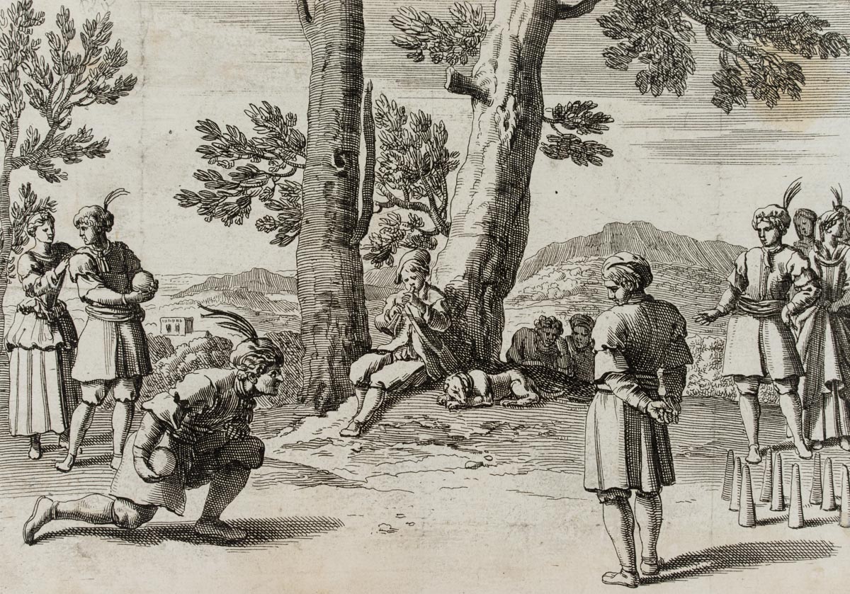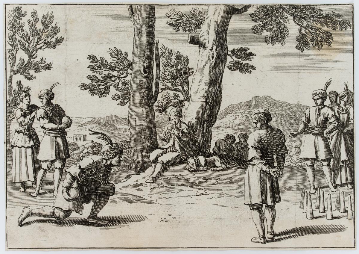 Unbekannt (17. Jahrhundert), Genredarstellung mit Edelleuten beim Kegelspiel, , Radierung