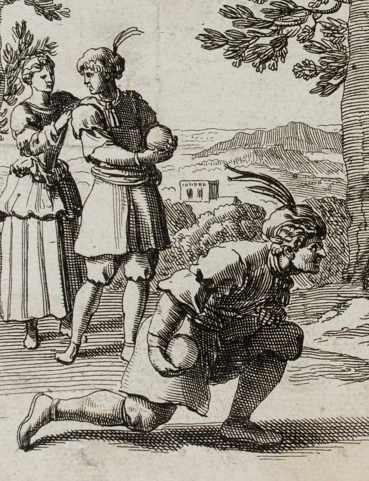 - Beschreibung: Mehrfigurige Genreszene auf einem Plateu in einer Hügellandschaft. Im Vordergrund ist ein Kegelspiel aufgebaut zu dem ein gebückter Jüngling gerade dabei ist die Kugel zu rollen. Einige interessierte Adelsleute beobachten den Wurf während ein Knabe dazu musiziert.