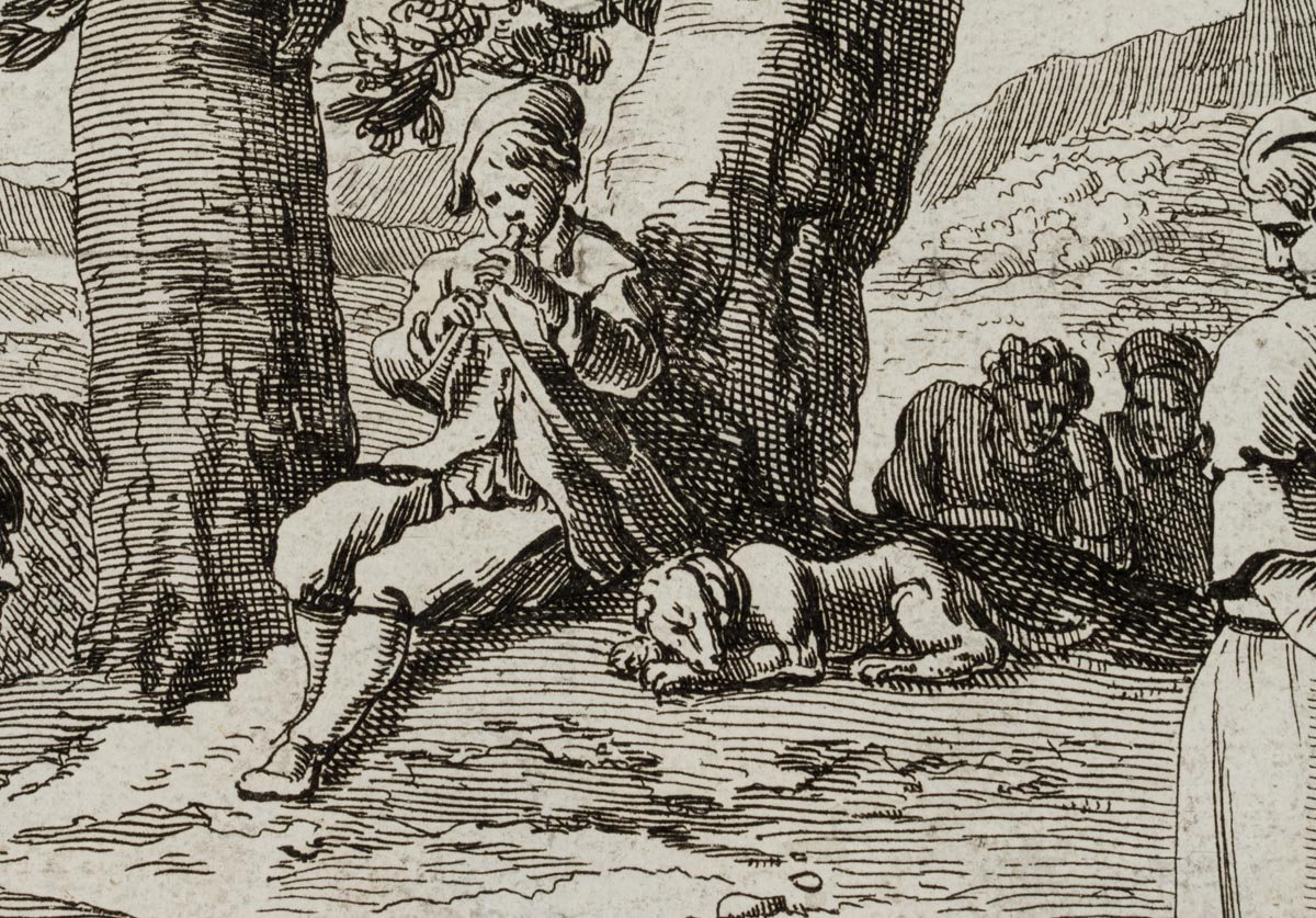 - Description: Genre scene with several figures on a plateau in a hilly landscape. In the foreground a skittles game is set up with a bent youth rolling the ball. Some interested noblemen watch the throw while a boy plays music.