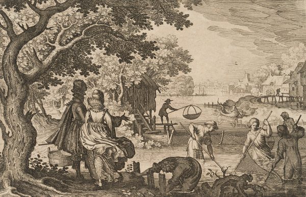 Unbekannt (17. Jahrhundert), Edelmann und Dame besuchen Fischzüchter, , Kupferstich