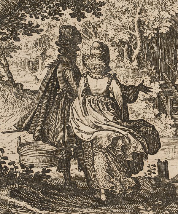 Unknown (17th century), Nobleman and lady visit fish farmer, , Copper engraving
