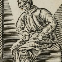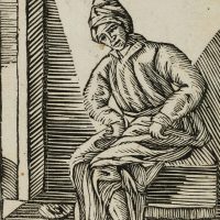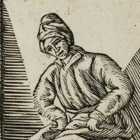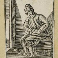- Beschreibung: In einem einfachen, kargen Innenraum ist eine weibliche Figur mit langem Gewand und Kopfbedeckung zu erkennen. Die Frau, die ihren Rock gerafft hält, sitzt auf einer Art Hocker, oder Nachtstuhl. Sie scheint dabei kaum Notiz von den Betrachtenden zu nehmen.
