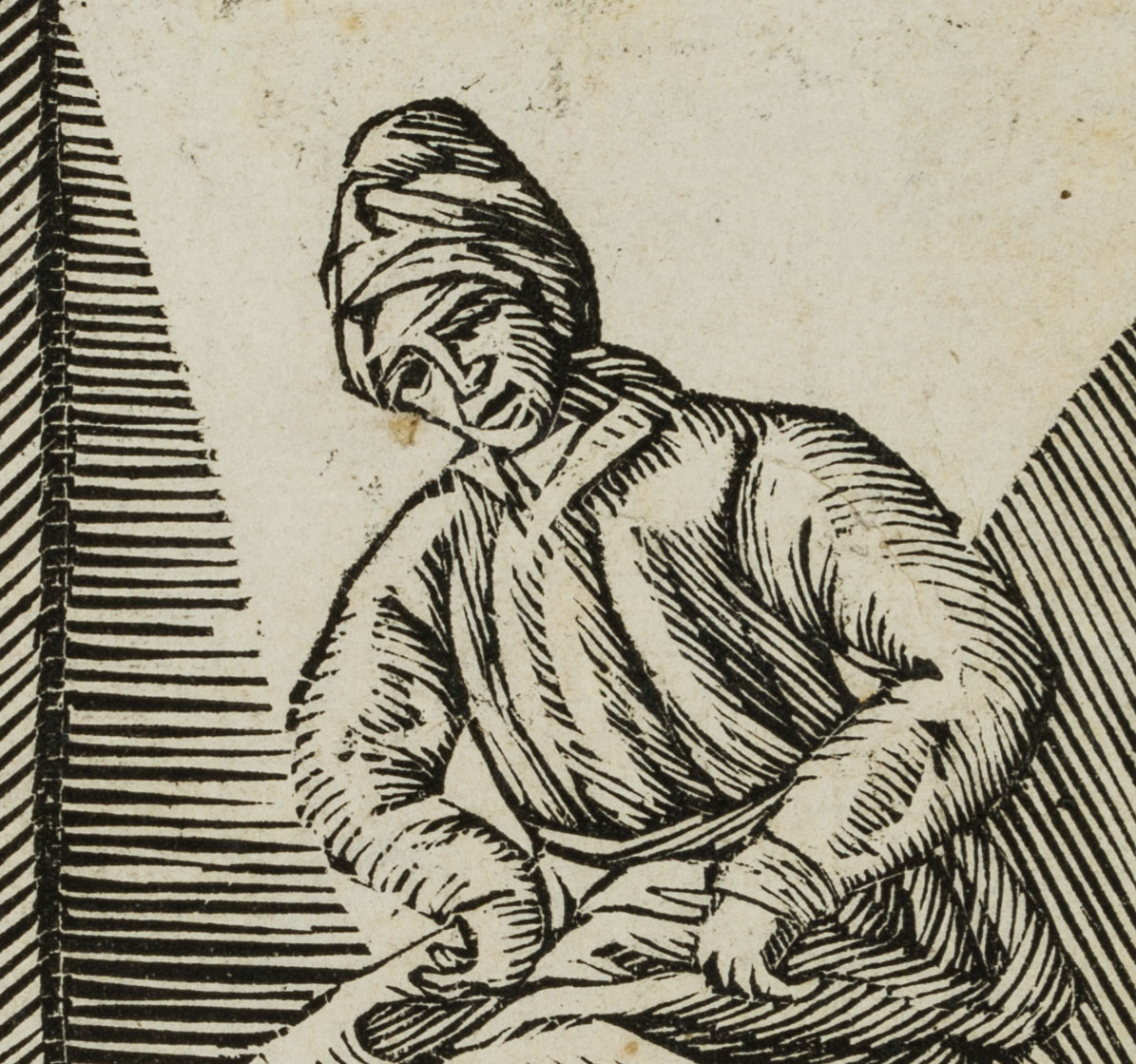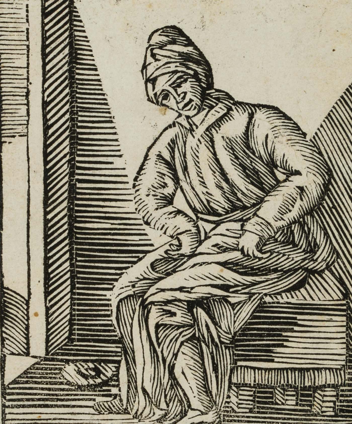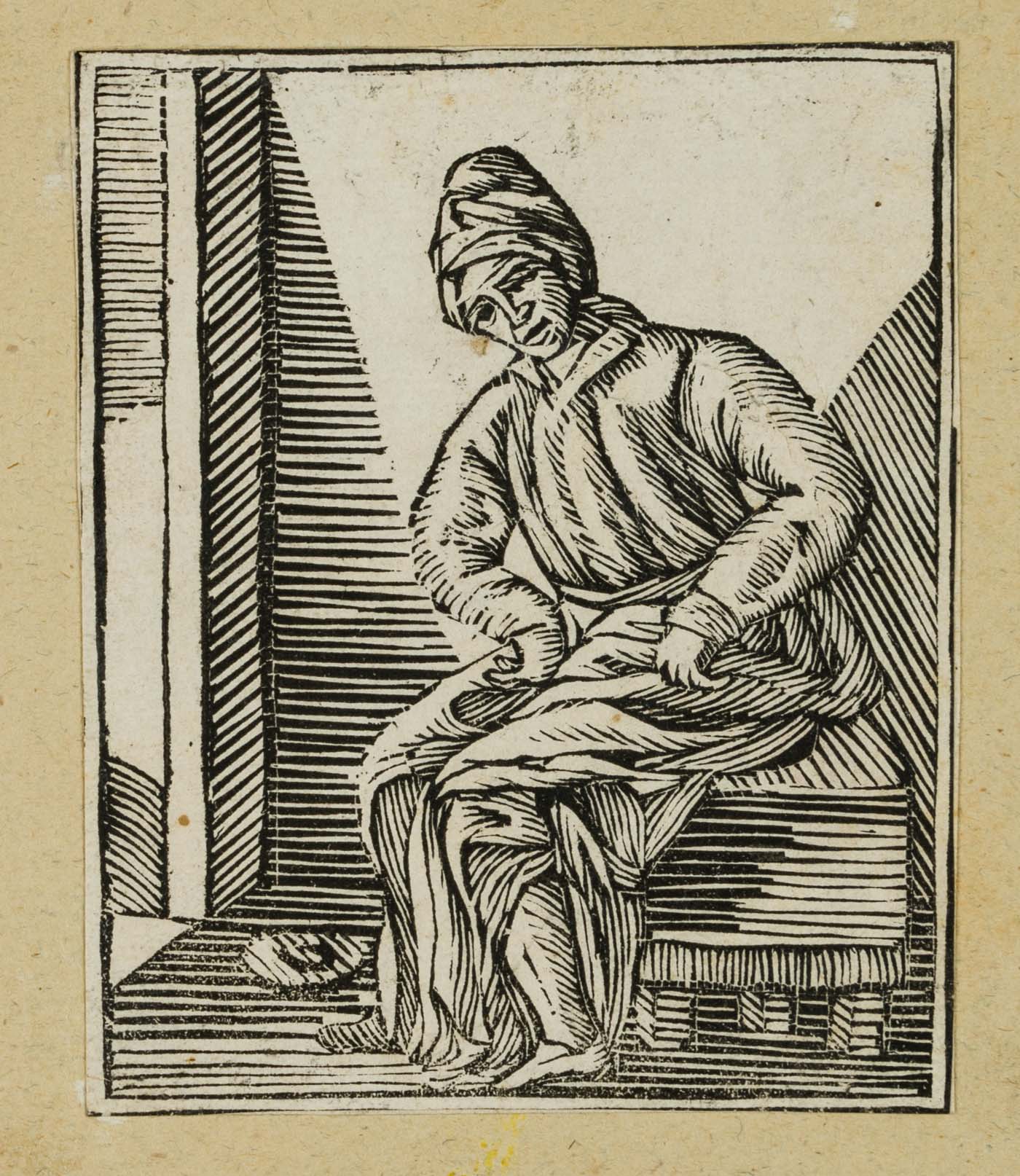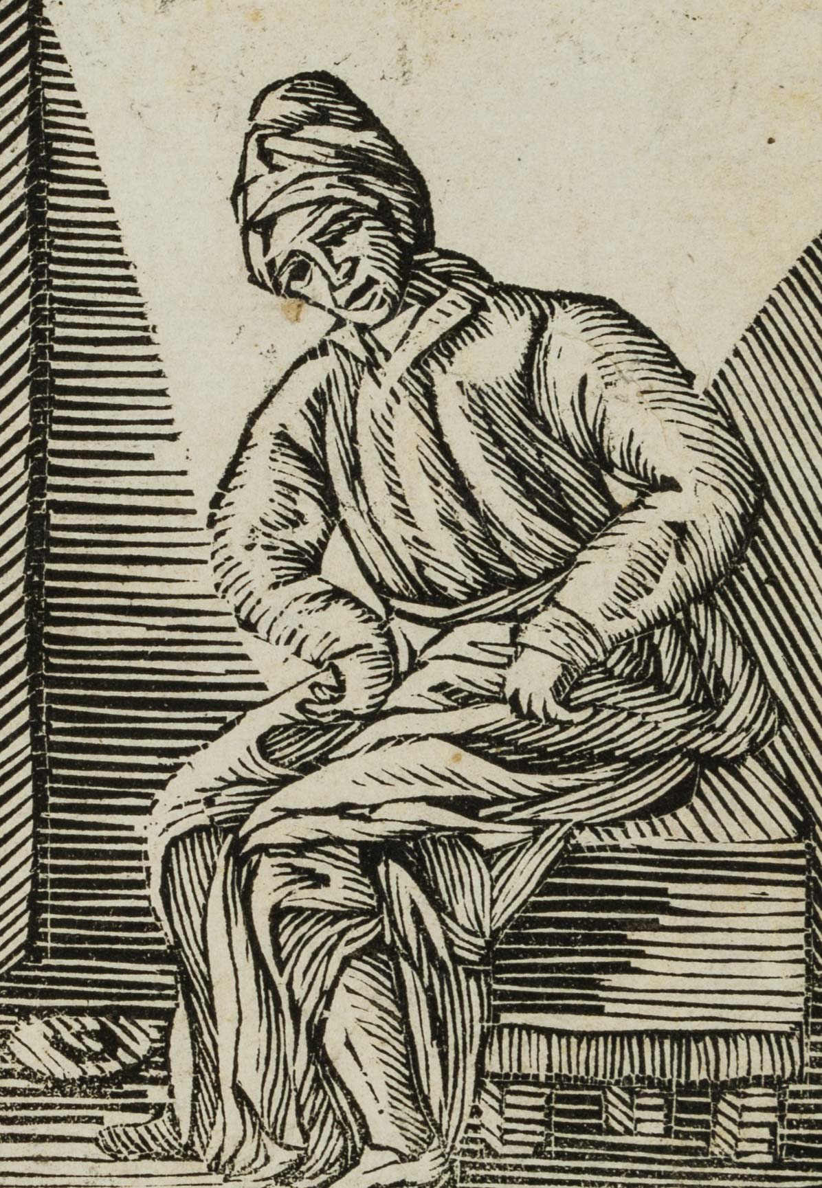 Unbekannt (17. Jahrhundert), Frau, auf einem Nachtstuhl sitzend, um 1700, Holzschnitt
