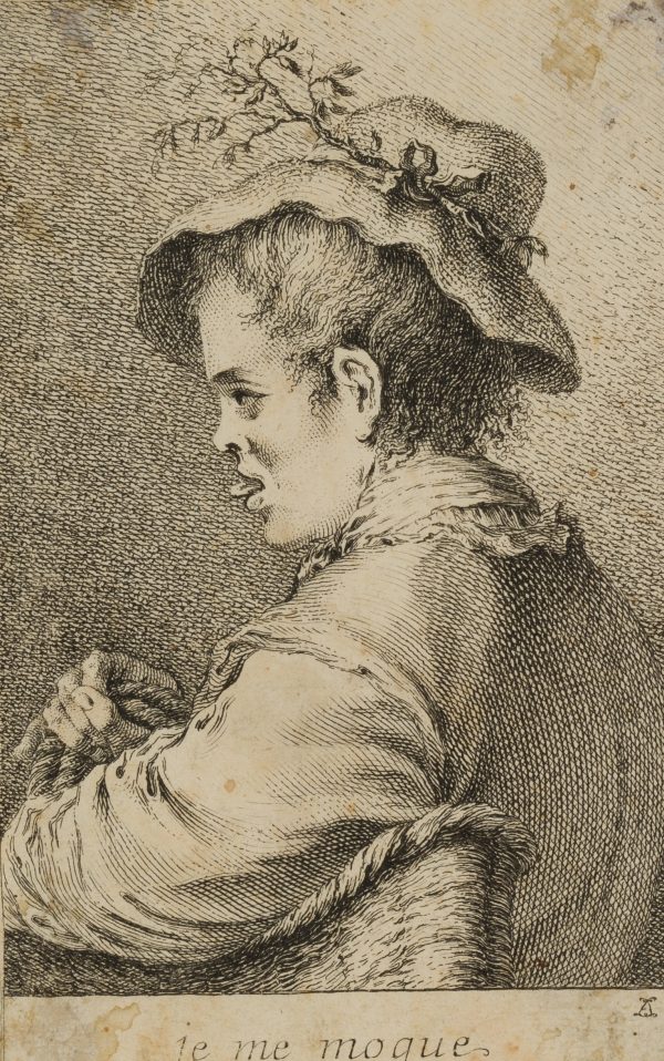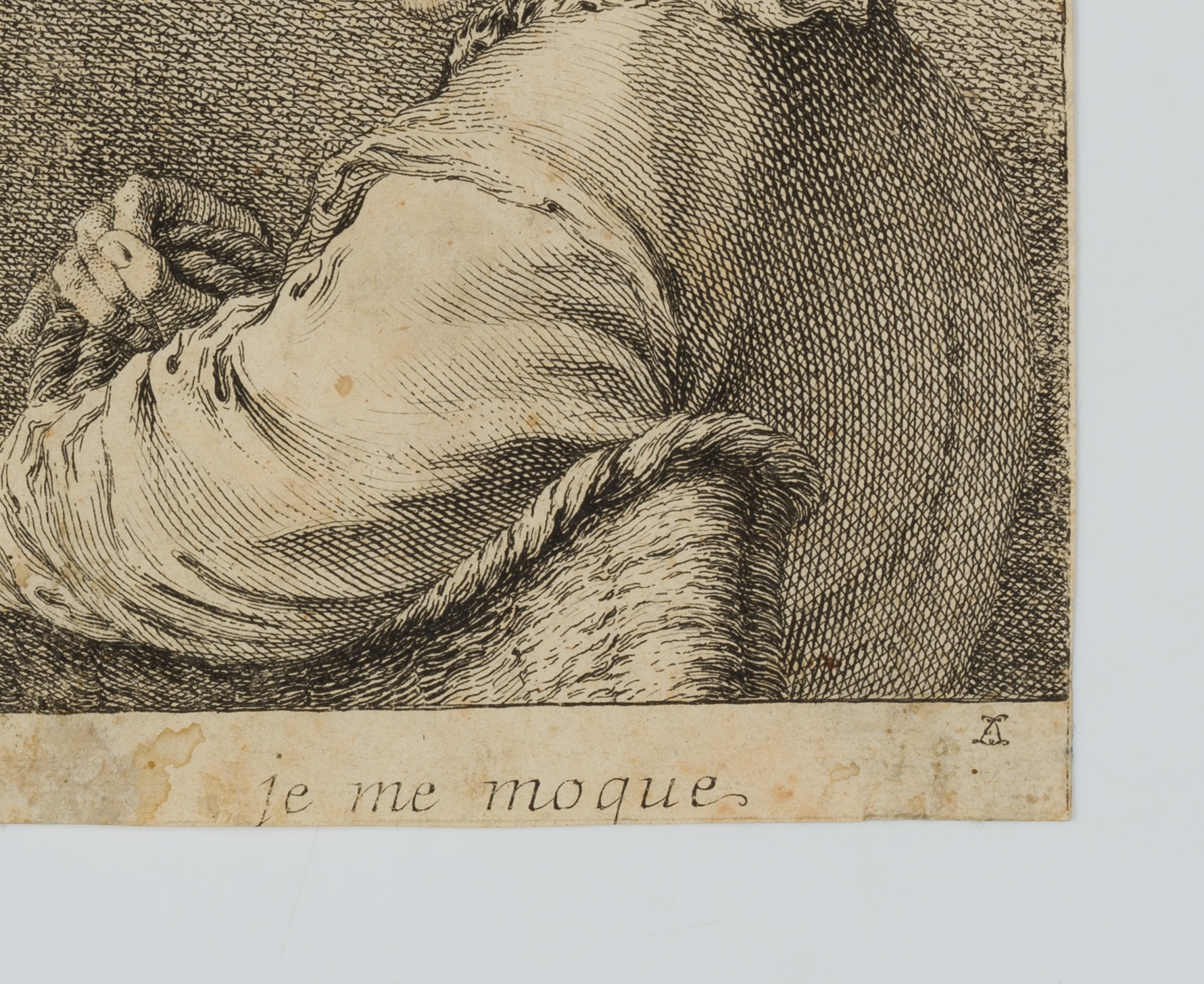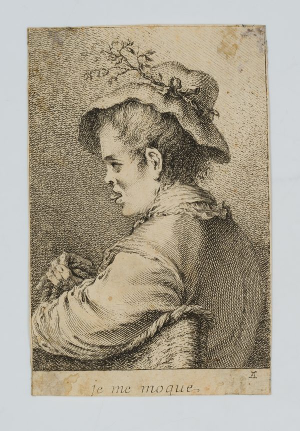 - Description: Genre-like bust portrait of a peasant woman with her tongue out and the inscription: Je me moque; I don’t care.