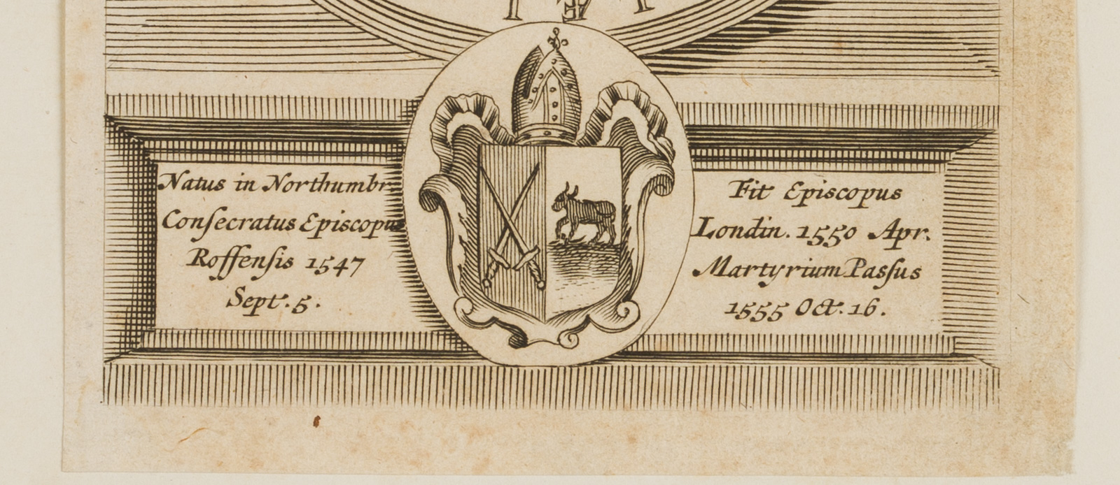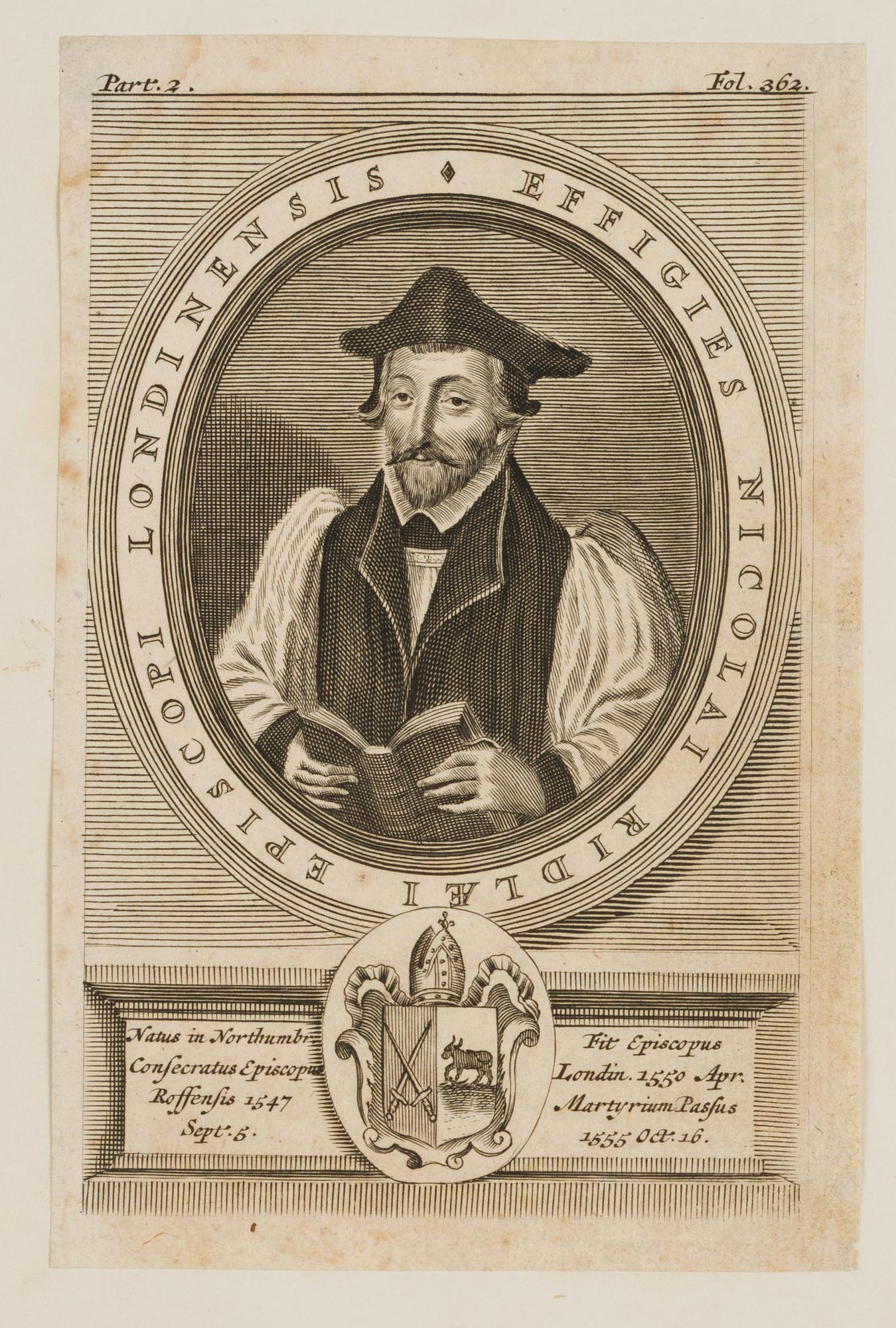 Unknown (17th century), Portrait of Nicholas Ridley (c 1500 Northumberland – 1555 Oxford), Bishop of Rochester (England) and martyr of the Anglican Church, , Copper engraving