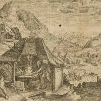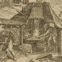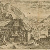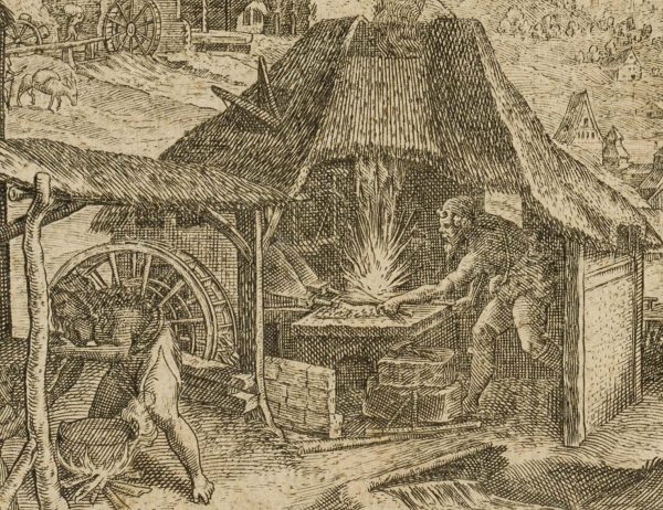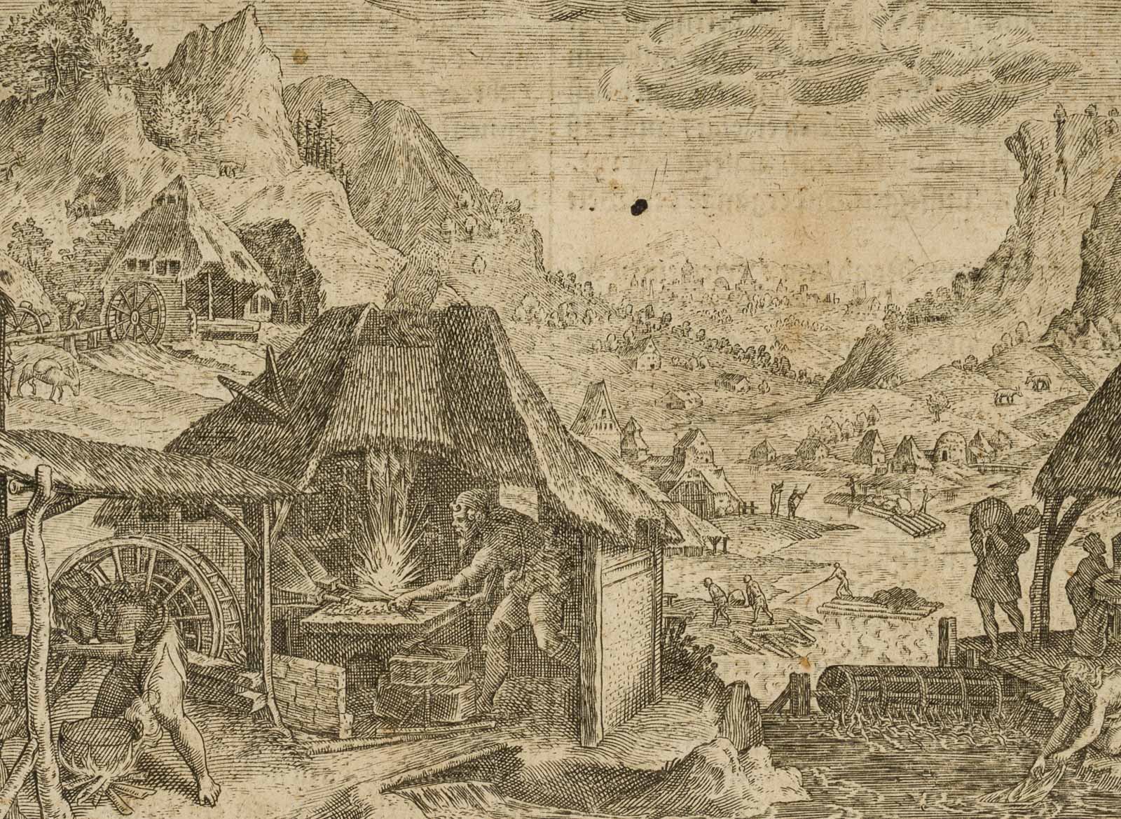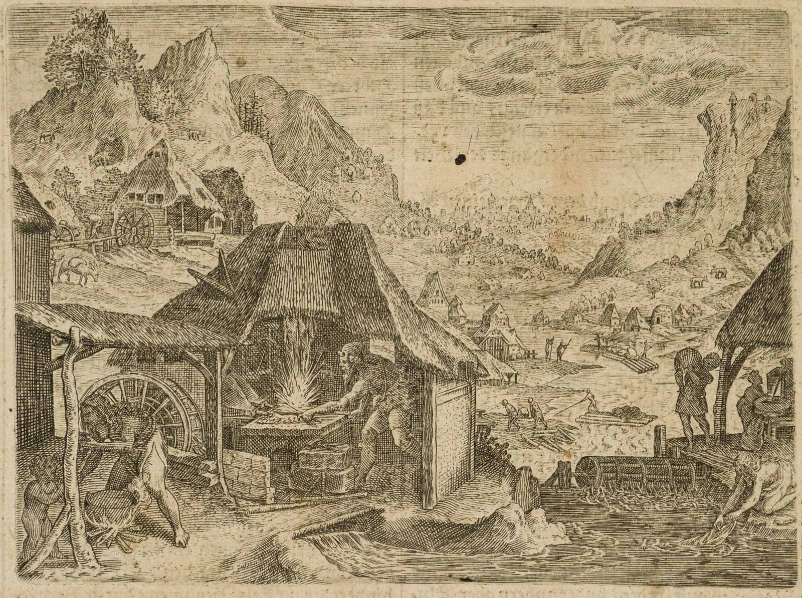 Unknown (17th century), Bible illustration Busy hustle and bustle Noah with his family preparing to build the ark with blacksmith’s work and water mill, c. 1650, Copper engraving