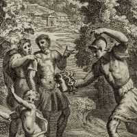 - Description: Scenic depiction of ancient Greek mythology. In a vast landscape, the hero Perseus runs after a boy with the severed head of the Gorgon Medusa.