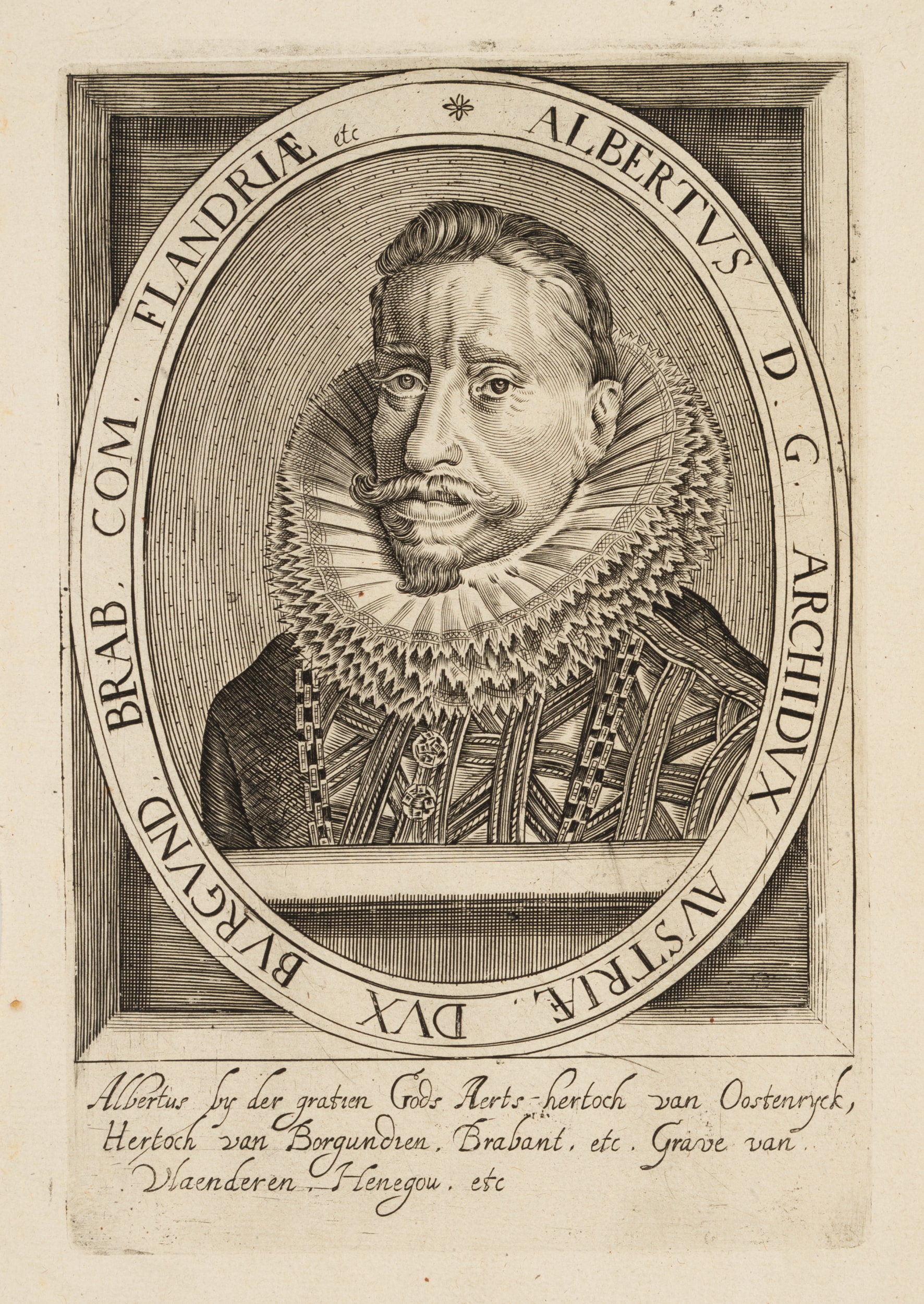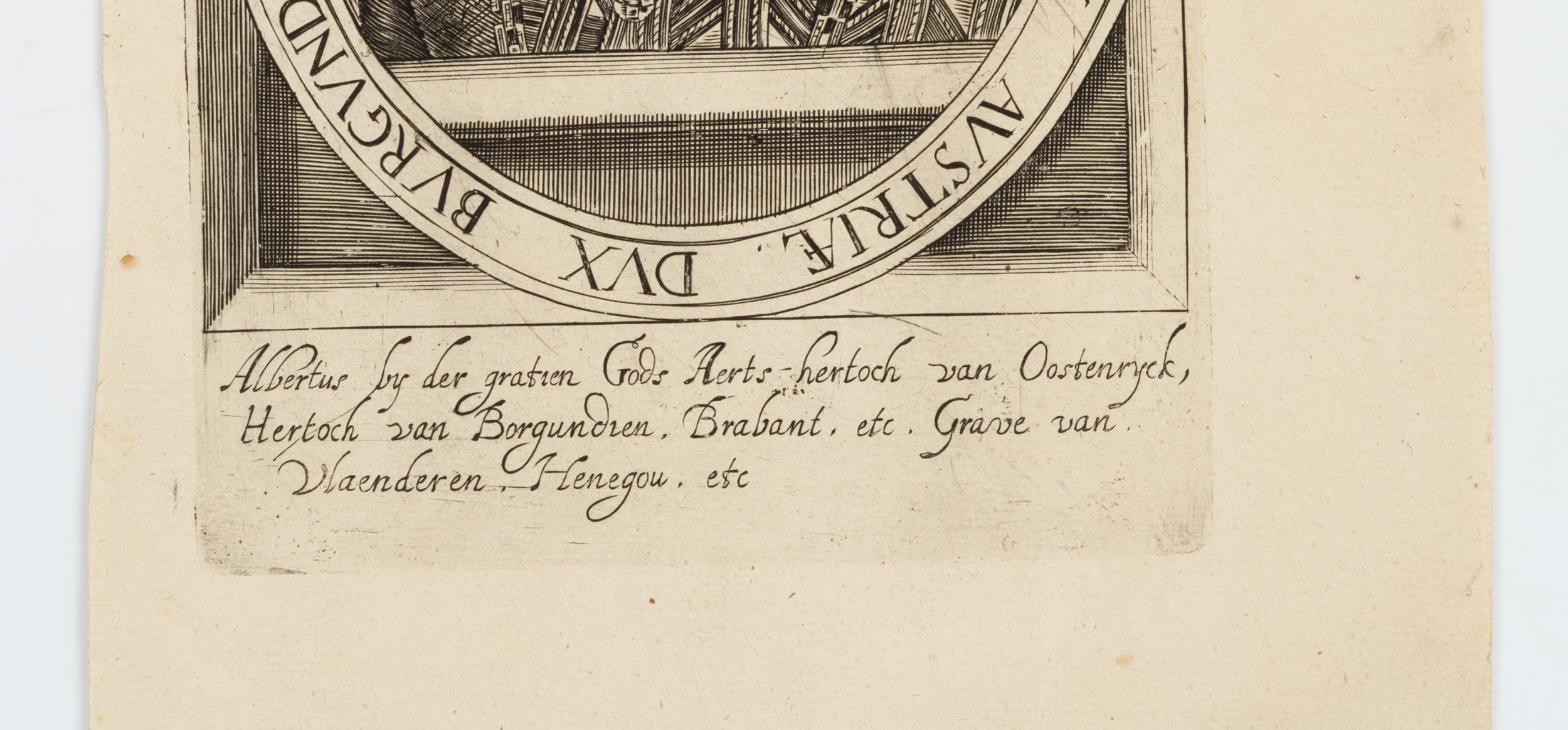 - Inscription: At the center inscribed in the printing plate: “ALBERTUS D.G. ARCHIDUX AUSTRIAE DUX BURGUND BRAB COM FLANDRIAE”. Lower middle further inscription: “Albertus by der gratsien Gods Aerts-hertoch […]”.