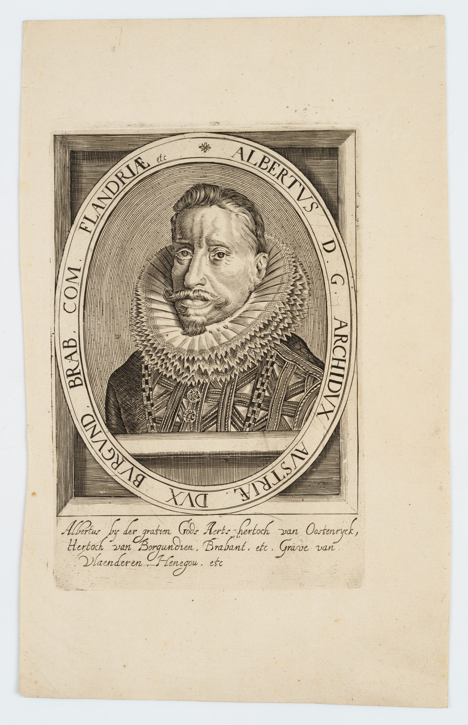 - Bezeichnung: Mittig im Druck bezeichnet: “ALBERTUS D.G. ARCHIDUX AUSTRIAE DUX BURGUND BRAB COM FLANDRIAE”. Unten mittig weitere Beschriftungen: “Albertus by der gratsien Gods Aerts-hertoch [..]”.