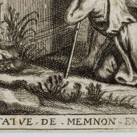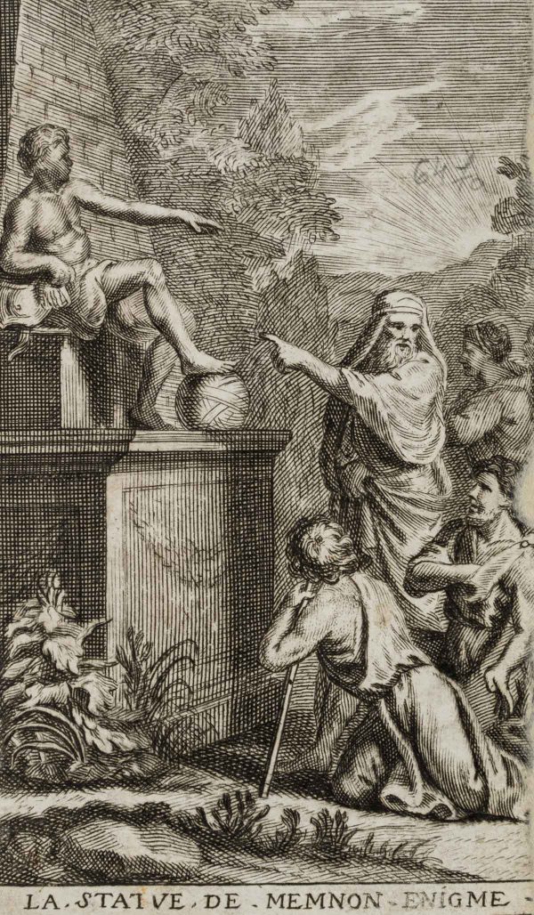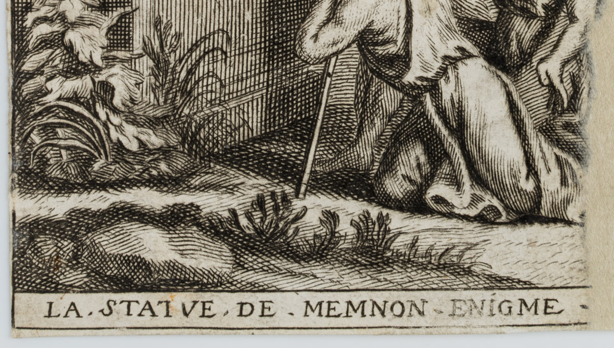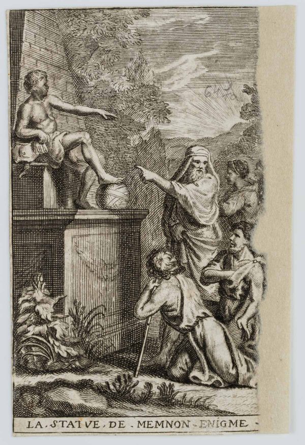 - Inscription: Inscribed below in the printing plate: “La Statue de Memnon Enigme”. On the reverse is the imprint of a typographical text.