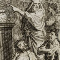 - Description: Scenic depiction of ancient Greek mythology. Showing some figures and a priest in front of a statue of the mythological king of Upper Egypt at a pyramid.