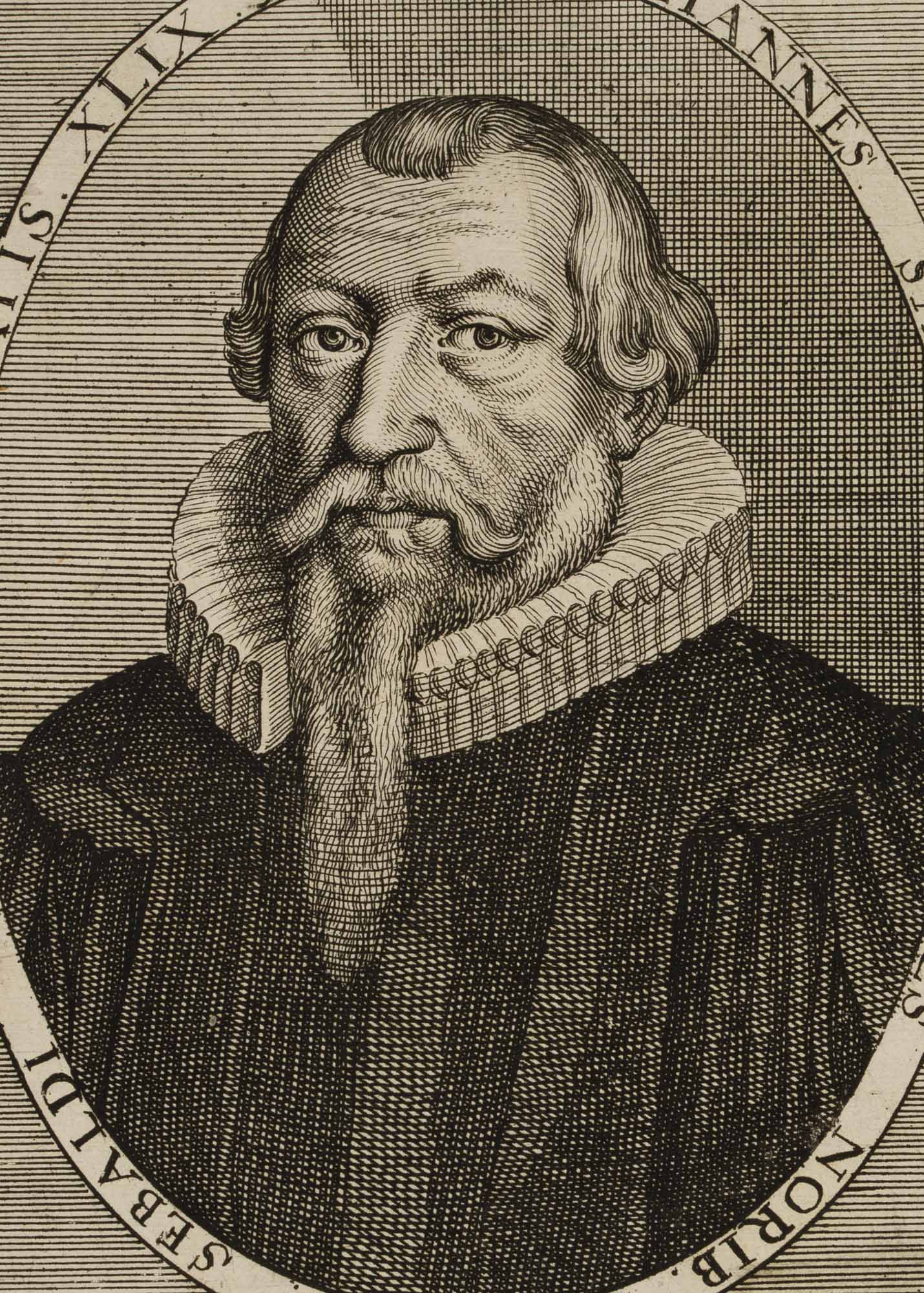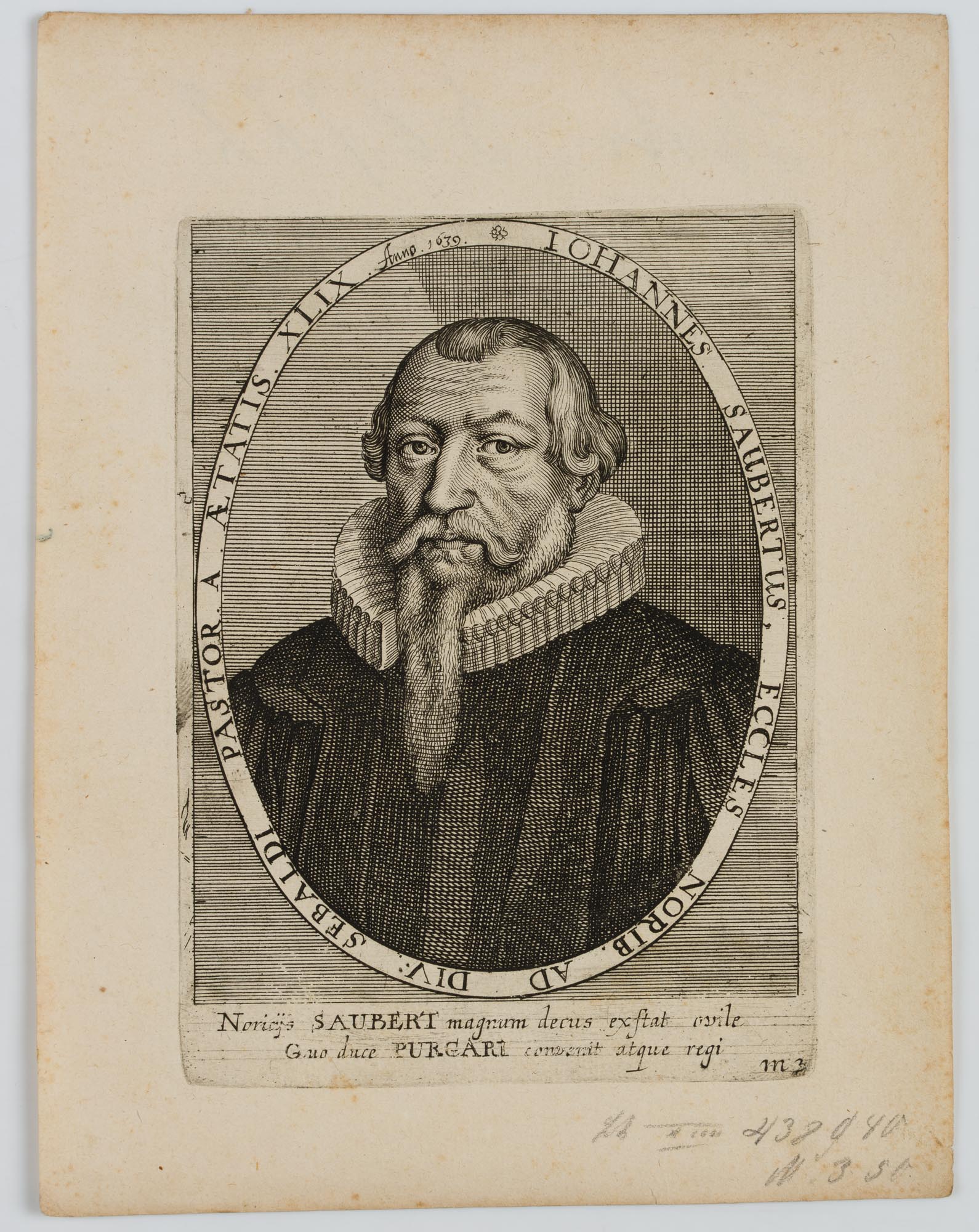 Unbekannt (17. Jahrhundert), Bildnis des lutherischen Theologen und Stadtbibliothekaren Johannes Saubert der Ältere (1592 Altdorf – 1646 Nürnberg), im Oval als Bruststück im Dreiviertelportrait nach links mit langem Bart, Halskrause und dunklem Mantel, 1639, Radierung