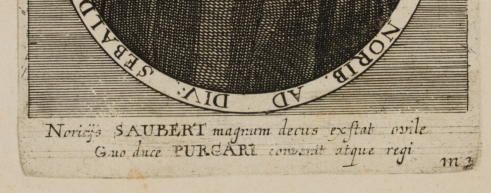 - Beschreibung: Mit dem Namen des Dargestellten und Datierung im Schriftzug um das Portrait, unten in der Druckplatte mit lateinischem Vers und der Angabe “m3”. Mit Wasserzeichen im Papier