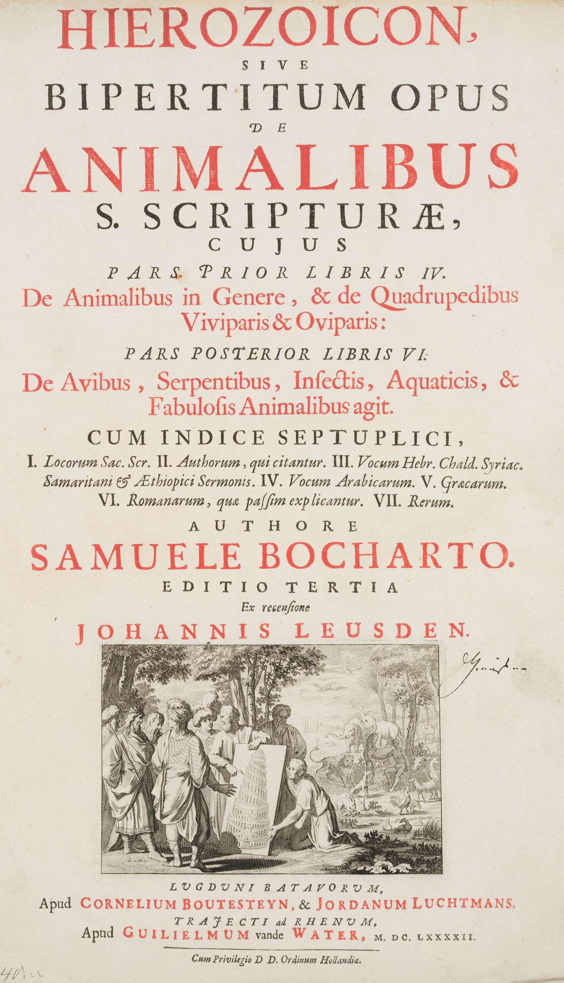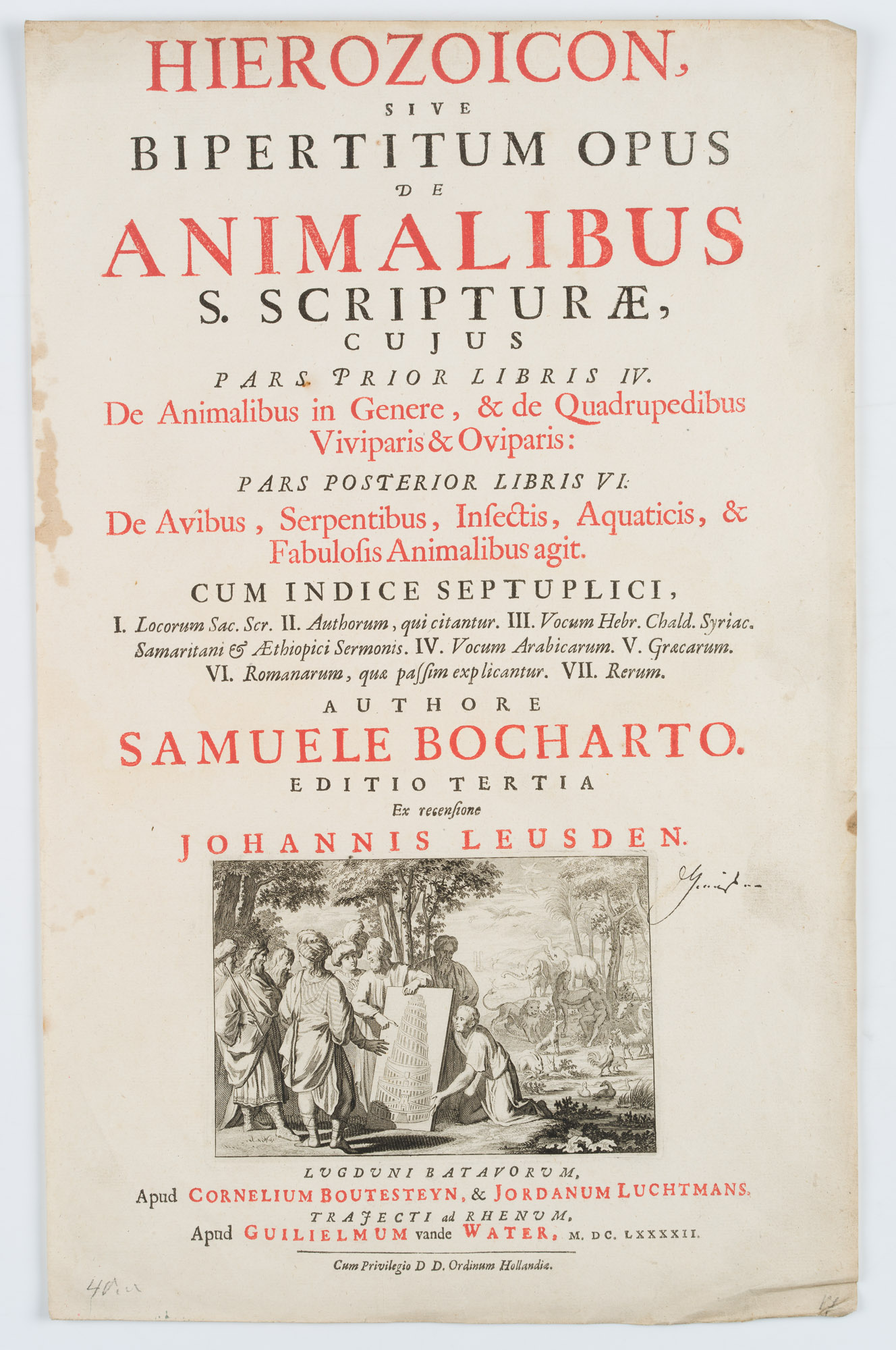 - Description: Author: Samuel Bochart; Title: Hierozoicon, Sive Bipertitum Opus De Animalibus S. Scripturae : Cum Indice Septuplici, I. Locorum Sac. Scr. II. Authorum, qui citantur. III. Vocum Hebr. Chald. Syriac. Samaritani et Aethiopici Sermonis …. 2: De Avibus, Serpentibus, Insectis, Aquaticis, & Fabulosis Animalibus; Contributed by: Johannes Leusden; Origin: Lugdunum Batavorum : Boutesteyn & Luchtmans [et al.], 1692. Samuel Bochart (1599 Rouen – 1667 Caen) was a Reformed theologian and orientalist, geographer and naturalist. After studying in Sedan, Saumur, London, Oxford and Leiden, he became a pastor in Caen in 1625.