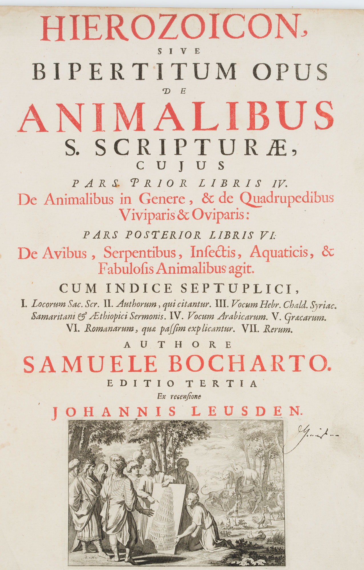 - Keywords: Title page, Hierozoicon, animals, Adam names the animals, Babel, Tower of Babel, Samuel Bochart, nature research