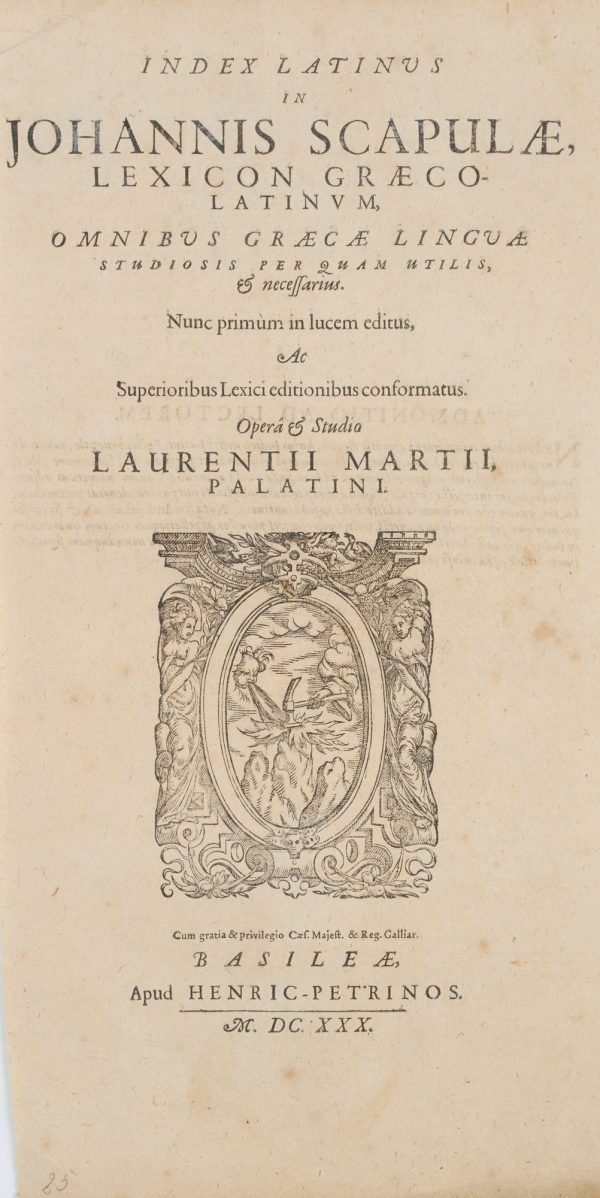 Unbekannt (17. Jahrhundert), Titelblatt ‘Johannis Scapulae Lexicon Graeco-Latinum’ 1630, von L. Martius, 1630, Kupferstich