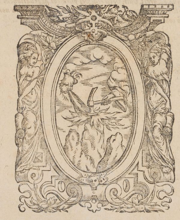- Description: The copper vignette shows a scene from the creation of the world. A hand from the sky models mountains and valleys with a hammer. A face from a cloud blows wind.