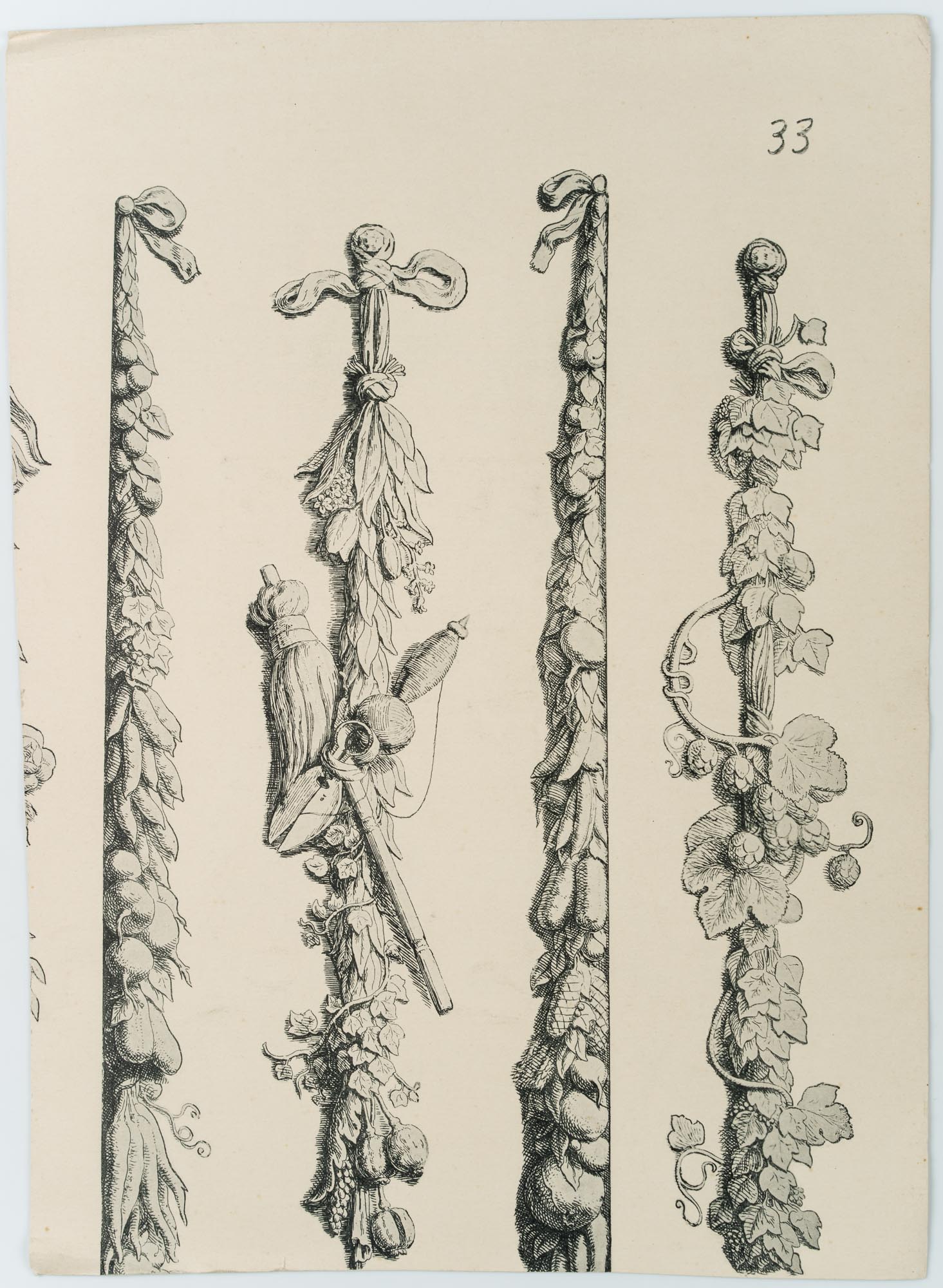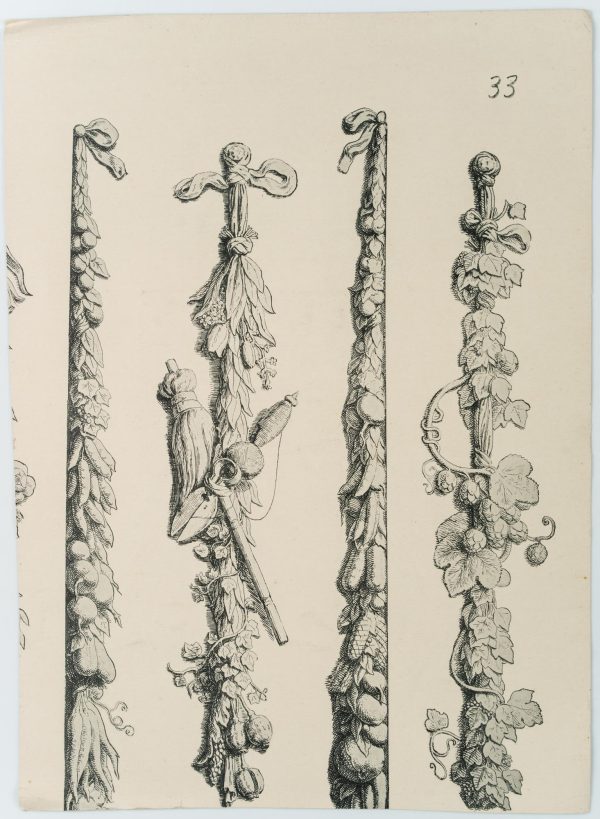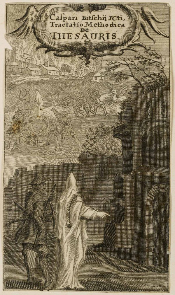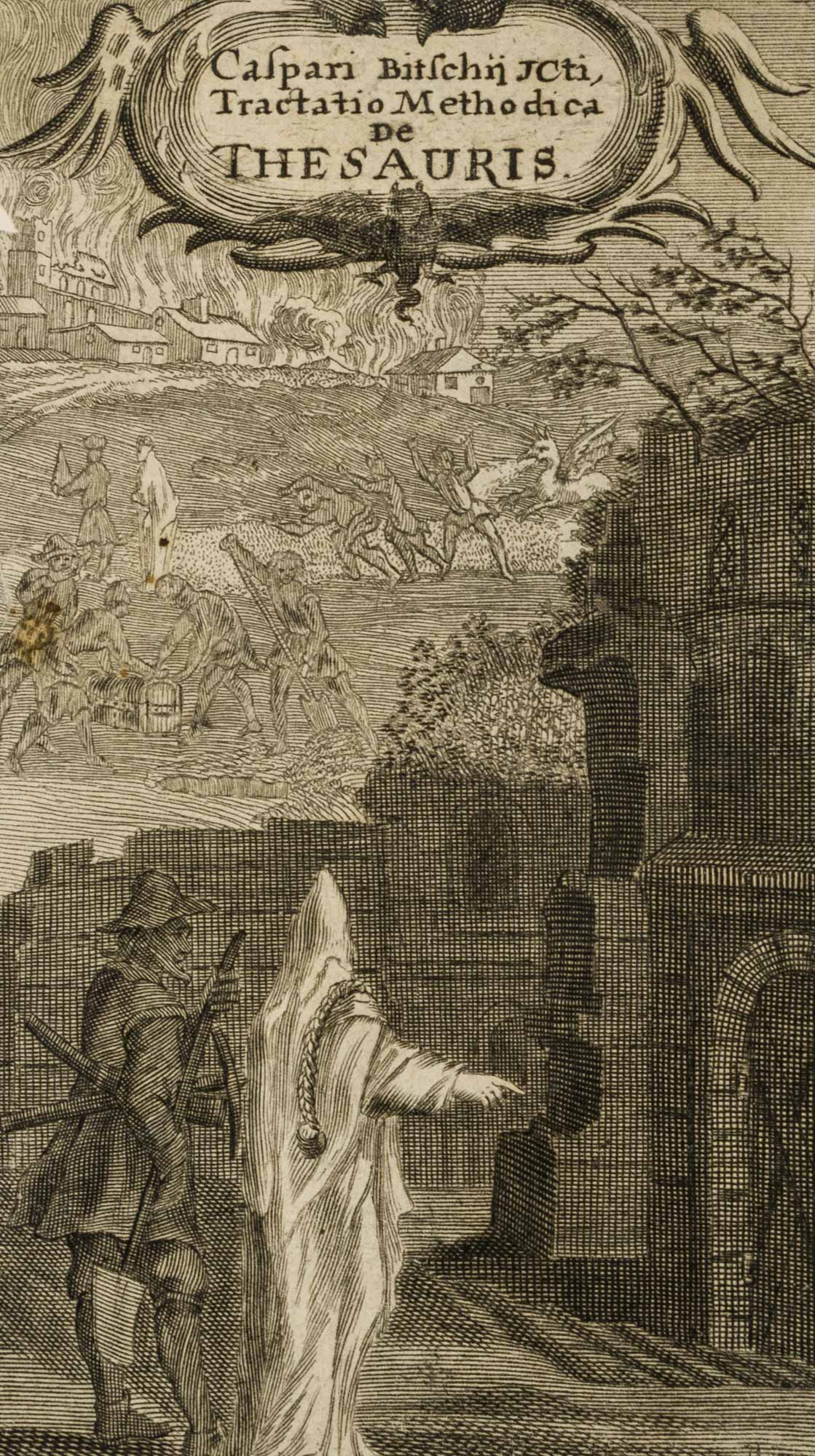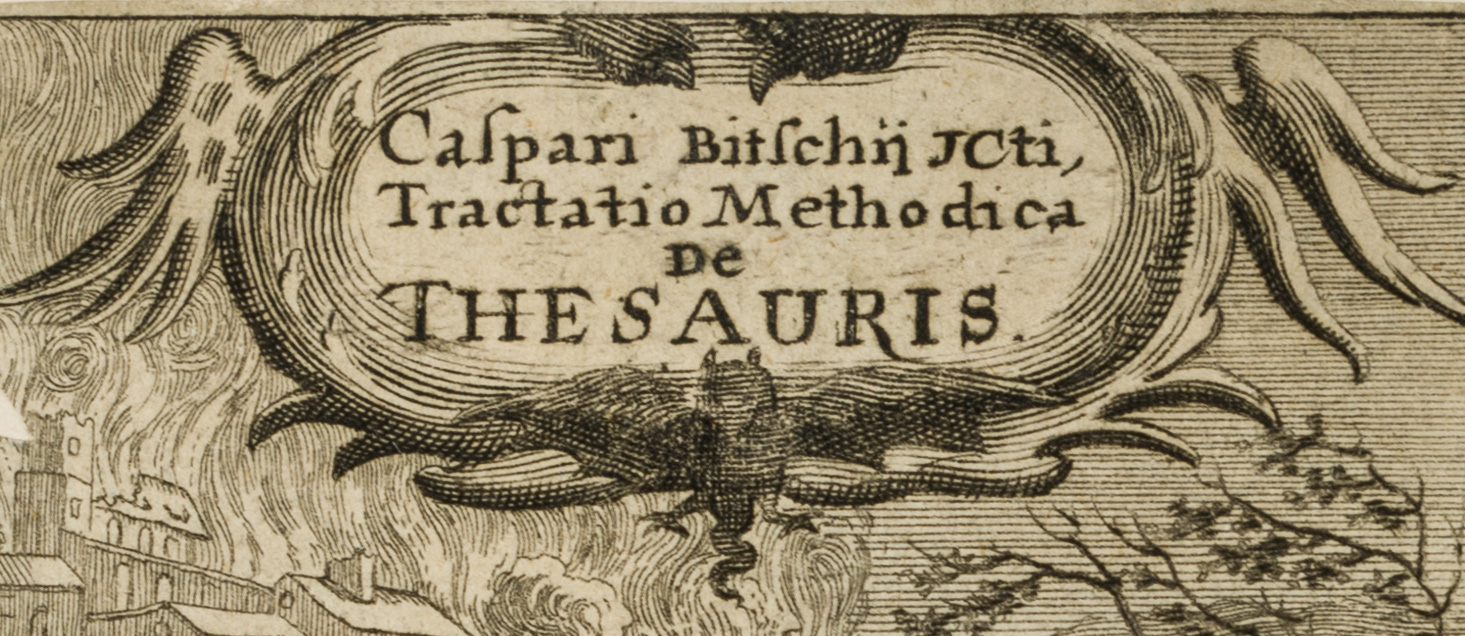 - Inscription: Above in the graphic the title and author of the narrative: “Caspari Bitschi ICti[?], Tractatio Methodica De THESAURIS.” Verso backing sheet: Decorative border-like bands of leaves and fruits.