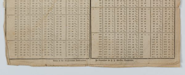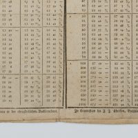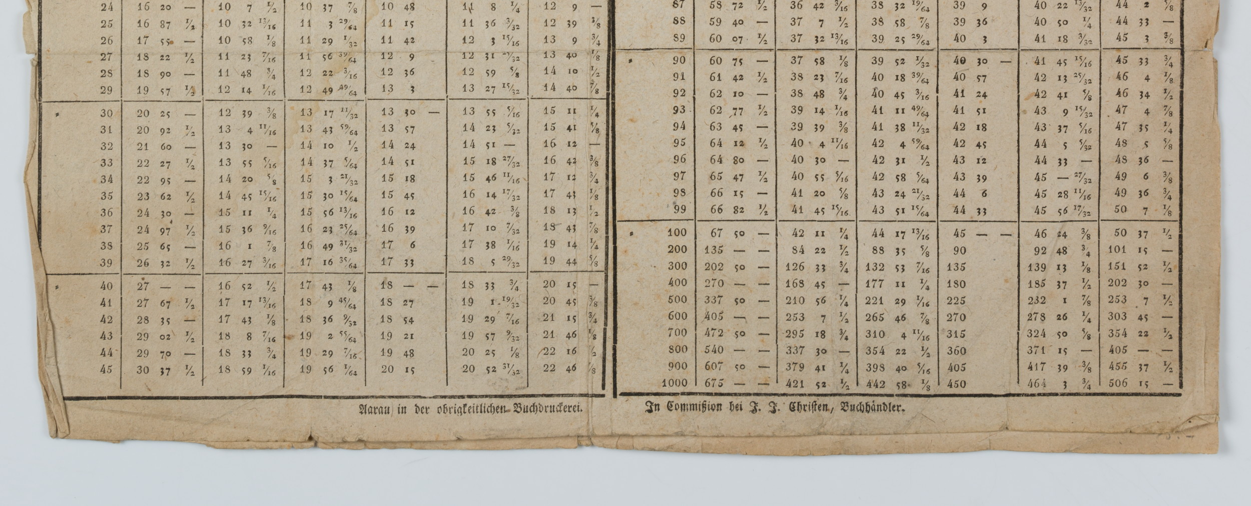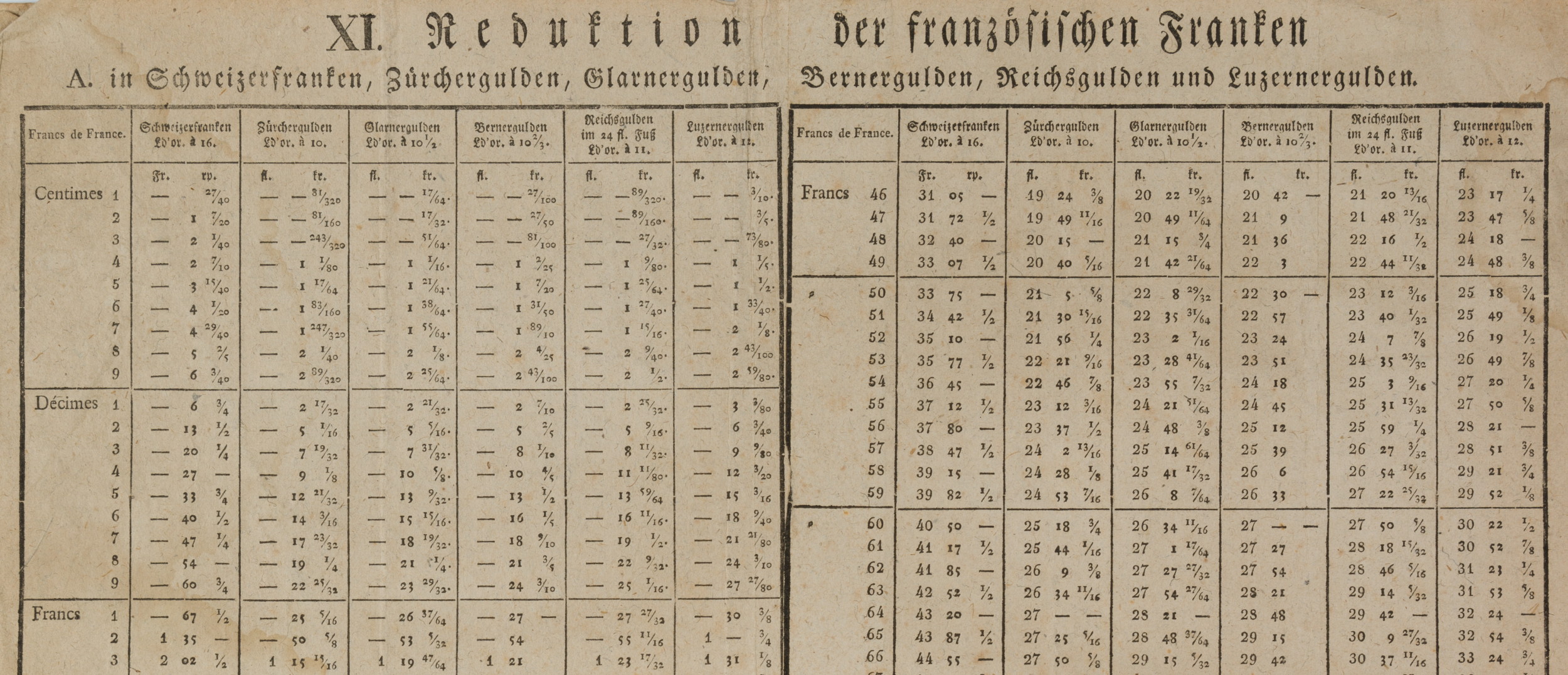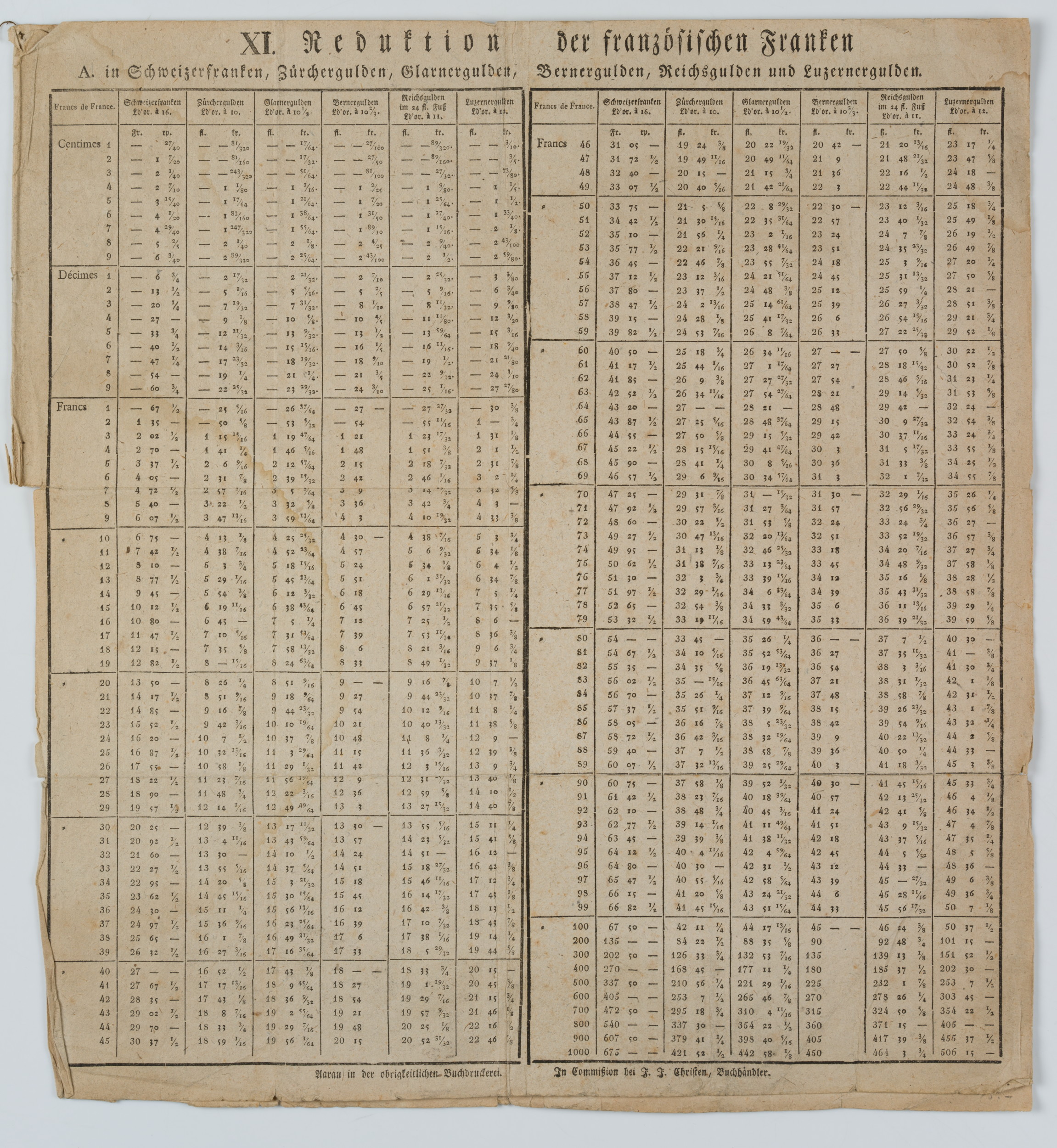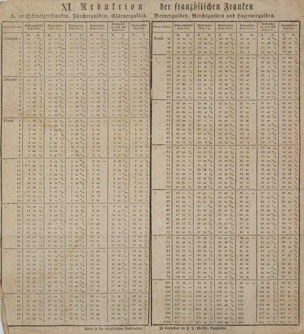 - Inscription: Upper middle inscribed in the printing plate: “XI. Reduktion der französischen Franken. A. in Schweizerfranken, Zürchergulden Glarnergulden, Bernergulden, Reichsgulden und Luzernergulden | XI. Reduktion der französischen Franken. B. in alte französische Livres, Z[?]ugergulden, Schwa[?]zergulden, Bündtnergulden, Conventionsgulden und Teßiner-Lire”.