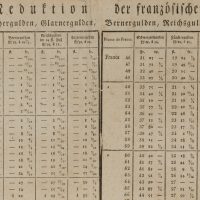 - Bezeichnung: Oben mittig im Druck bezeichnet: “XI. Reduktion der französischen Franken. A. in Schweizerfranken, Zürchergulden Glarnergulden, Bernergulden, Reichsgulden und Luzernergulden | XI. Reduktion der französischen Franken. B. in alte französische Livres, Z[?]ugergulden, Schwa[?]zergulden, Bündtnergulden, Conventionsgulden und Teßiner-Lire”.