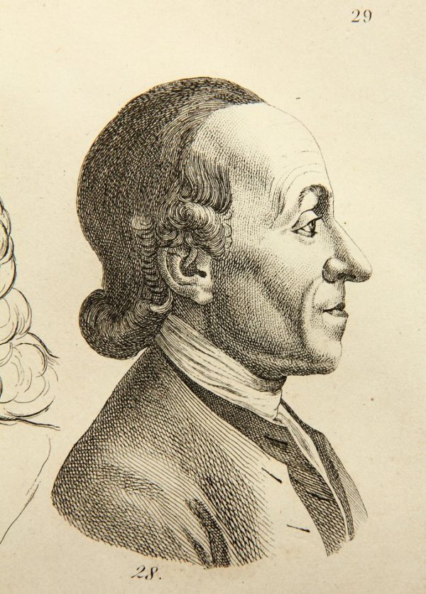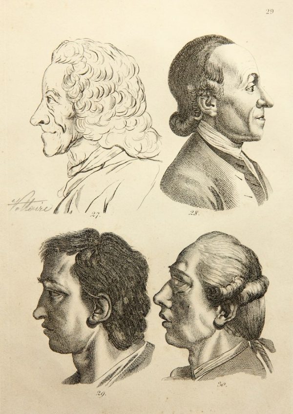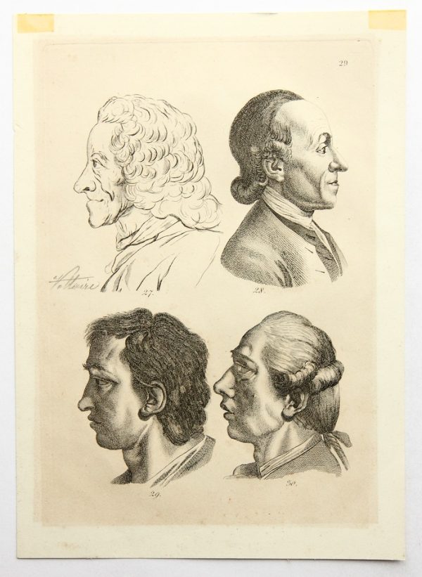 - Description: Four male bust portraits in profile, showing among others the two philosophers and scholars of the Enlightenment Voltaire and Lavater. Johann Caspar Lavater is known for his study of human physiognomy and the writings he published on the subject, such as Physiognomische Fragmente zur Beförderung der Menschenkenntnis und Menschenliebe in vier Volumes, 1775-78. The present sheet is presumably a page from Lavater’s work, which shows numerous portraits of contemporary scholars.