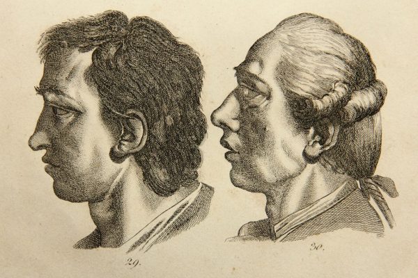 - Beschreibung: Vier männliche Büstenporträts im Profil, unter anderem die beiden Philosophen und Gelehrten der Aufklärung Voltaire und Lavater zeigend. Johann Caspar Lavater ist bekannt für seine Beschäftigung mit der menschlichen Physiognomie und die dazu herausgegebenen Schriften wie Physiognomische Fragmente zur Beförderung der Menschenkenntnis und Menschenliebe in vier Bänden, 1775–78. Vermutlich handelt es sich bei dem vorliegenden Blatt um eine Seite aus dem Werk Lavaters, die zahlreiche Porträts von zeitgenössisschen Gelehrten zeigen.
