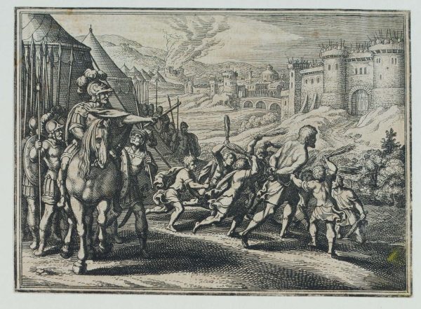 - Description: In the front with the army commander calling for an attack, in the centre the battle with the giant and in the background a fortified city with soldiers positioned for defence.