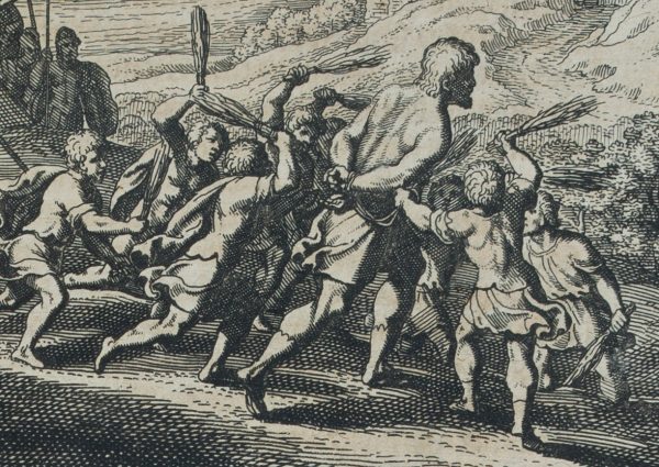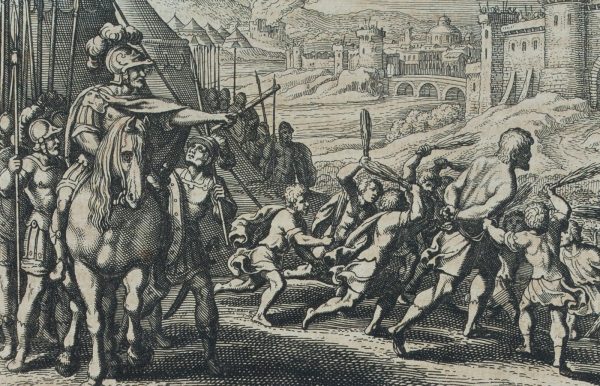 - Beschreibung: Vorne mit Heerführer, der zum Angriff aufruft, mittig der Kampf mit dem Riesen und im Hintergrund eine befestigte Stadt mit zur Abwehr aufgestellten Soldaten.