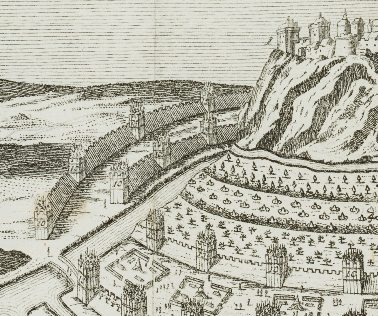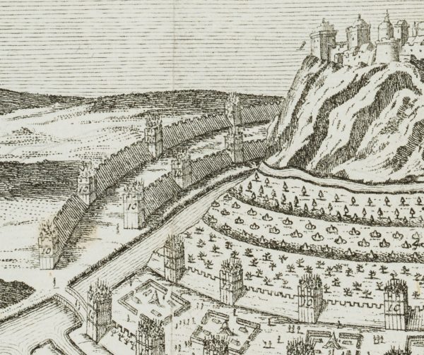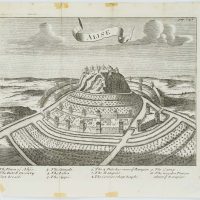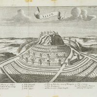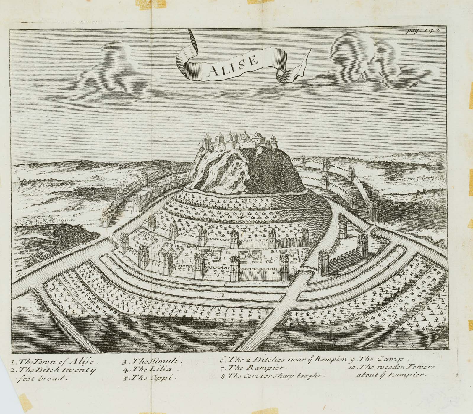 - Beschreibung: Oberhalb der Darstellung betitelt, rechts oben in der Darstellung bezeichnt: “pag: 142”; verso nummeriert: “1138” sowie unleserlicher Sammlername. Dekorative Darstellung der Stadt Alise, mit Legende 1-10 innerhalb der Platte unterhalb der Darstellung. Der Name “Alise” geht vermutlich zurück auf die alte Bezeichnung “Alesia”; Forschungen haben ergeben, dass sich hier wahrscheinlich das antike Alesia befand; In der Schlacht um Alesia eroberte Julius Caesar die gallische Festung. Dieses Oppidum blieb daraufhin im Gegensatz zu vielen anderen weiterhin besiedelt und wurde erst im Frühmittelalter aufgegeben; neue Siedlungen entstanden im Laufe der Zeit, die größte ist das heutige Alise-Sainte Reine: im Département Côte-d’Or gelegene, französische Gemeinde im Südwesten des Mont Auxois.