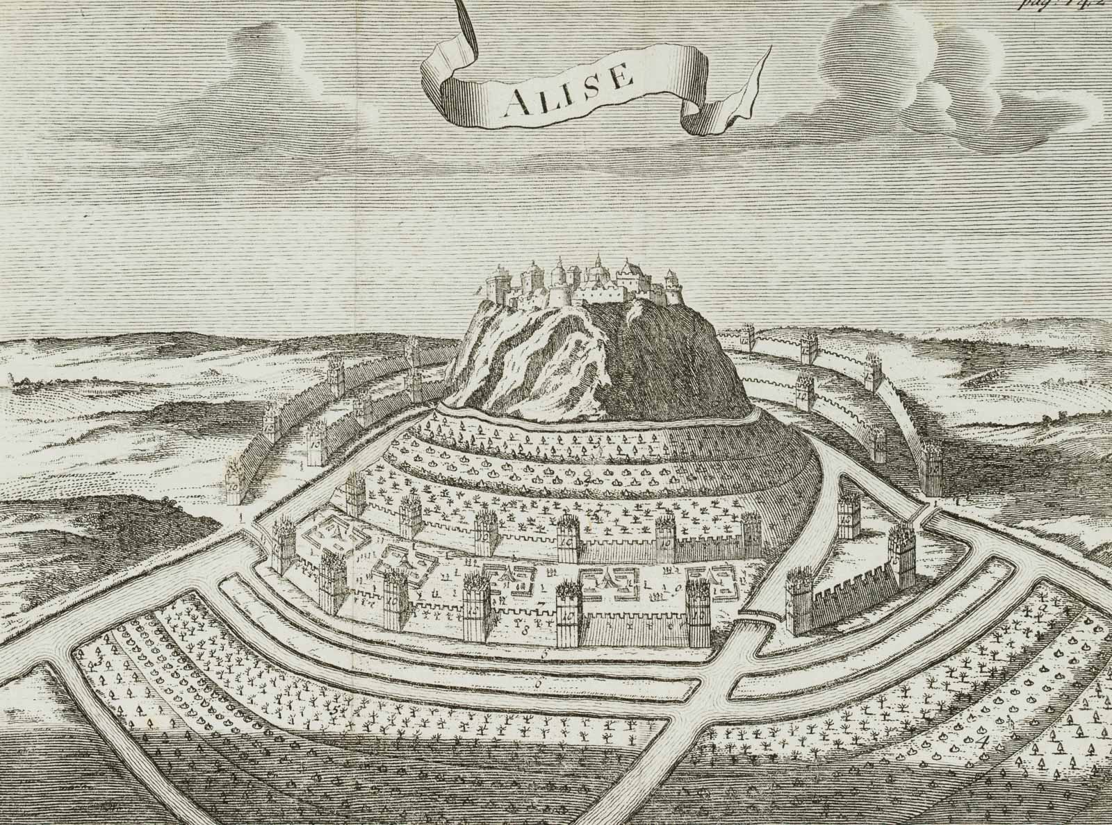 - Description: Titled above the depiction, inscribed at upper right in the depiction: “pag: 142”; numbered on verso: “1138” as well as illegible collector’s name. Decorative depiction of the town of Alise, with legend 1-10 within the plate below the depiction. The name “Alise” probably goes back to the ancient name “Alesia”; research has shown that the ancient Alesia was probably located here; Julius Caesar conquered the Gallic fortress in the Battle of Alesia. This oppidum then remained inhabited, unlike many others, and was only abandoned in the early Middle Ages; new settlements sprang up over time, the largest being today’s Alise-Sainte Reine: located in the Côte-d’Or department, French commune to the southwest of Mont Auxois.