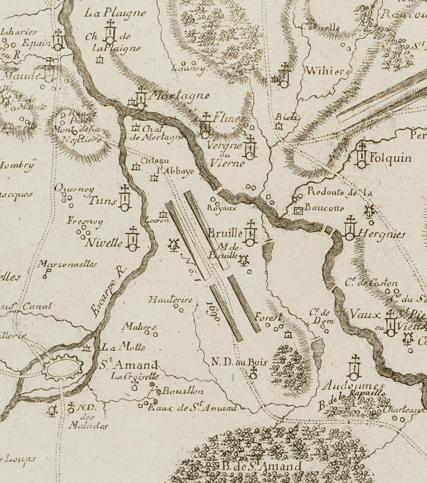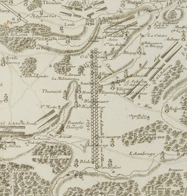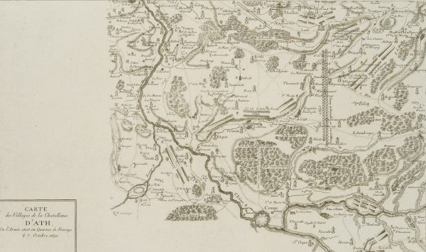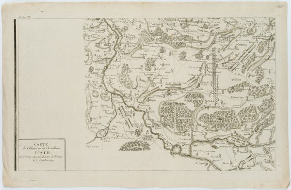 Inscribed and dated in the title cartouche in the lower left corner: “Carte des Villages de la Chatellerie D’ATH, ou l’Armée etoit en Quartier de Fourage le 7. Octobre 1692.”; numbered in the upper left inside the printing plate with: “Sectio 13”.