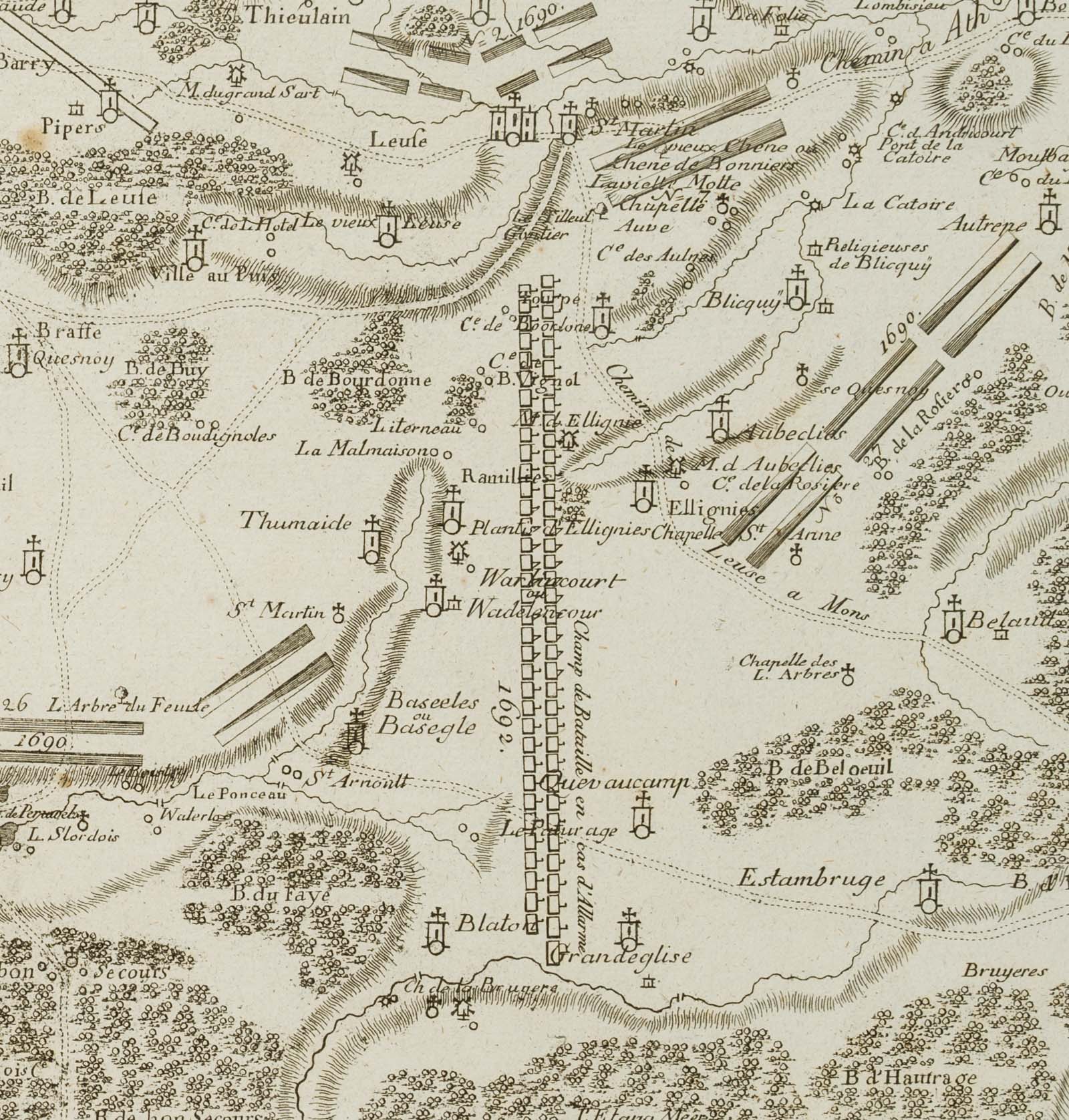 In der Titelkartusche in der linken unteren Ecke bezeichnet und datiert: “Carte des Villages de la Chatellerie D’ATH, ou l’Armée etoit en Quartier de Fourage le 7. Octobre 1692.”; oben links innerhalb der Druckplatte nummeriert mit: “Sectio 13”.