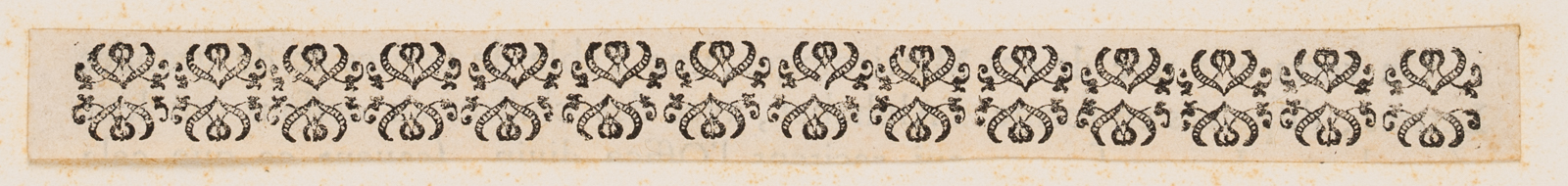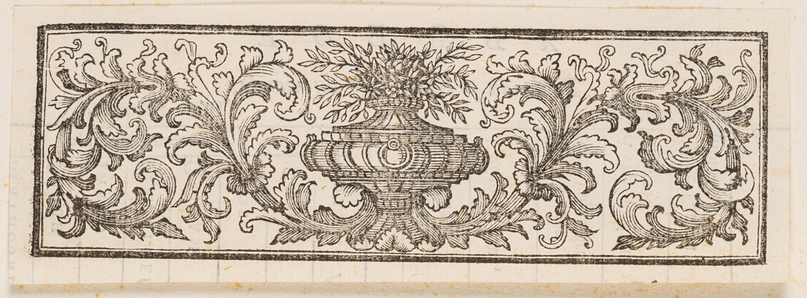 Unbekannt (18. Jahrhundert), Französisch, Barocker Buchschmuck. Zwei schmale und eine breite Zierleiste mit Blumenbouquet und floralem Rankenwerk, 1735, Holzschnitt