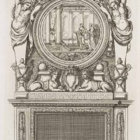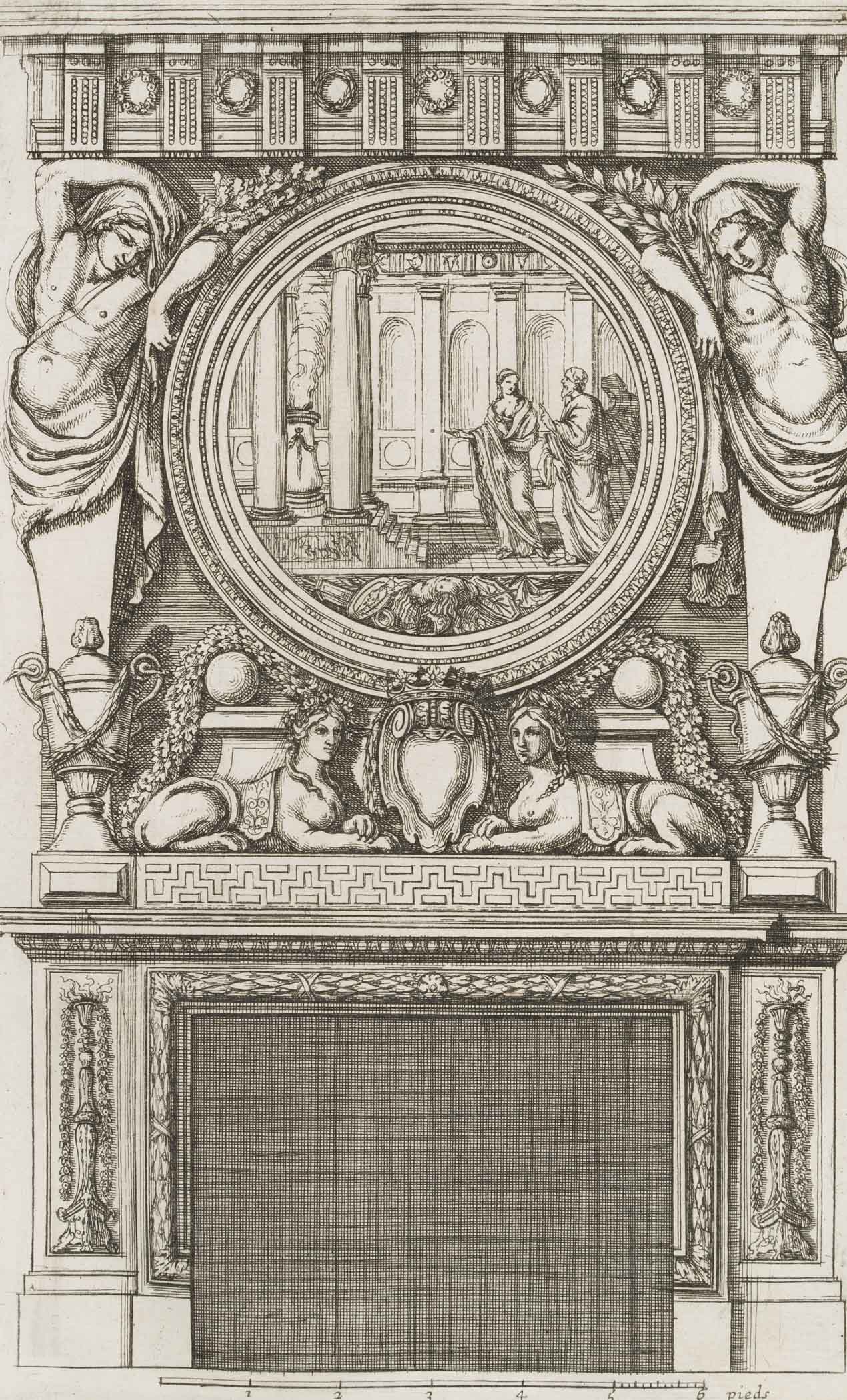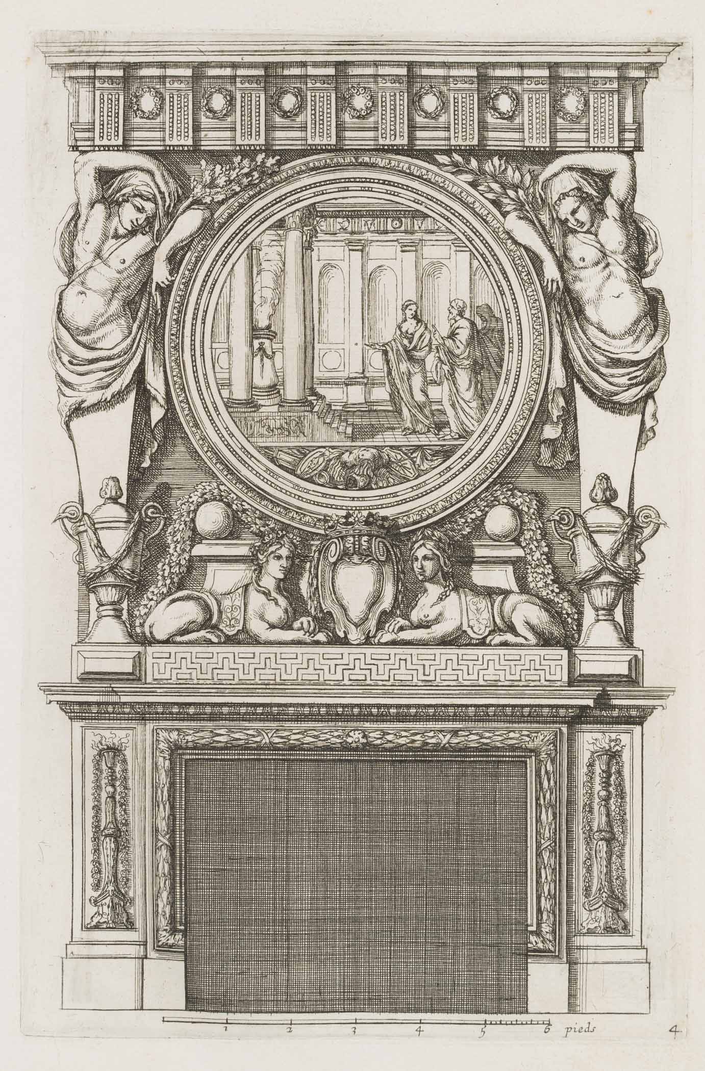 - Description: Baroque fireplace design with figural decoration and scenes of ancient architecture and persons in Attic classical garb. The fireplace is supported on the left and right by atlases and guarded by two sphinxes.