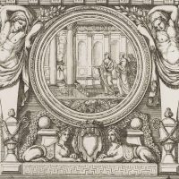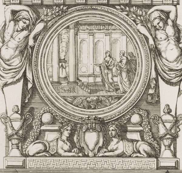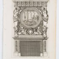 - Beschreibung: Barocker Kaminentwurf mit Figurenschmuck und Szenen mit antiker Architektur und Personen in attisch klassischer Gewandung. Der Kamin wird links und rechts von Atlanten getragen und von zwei Sphingen bewacht