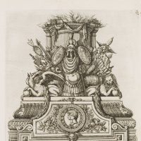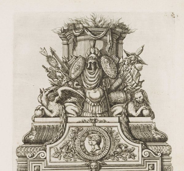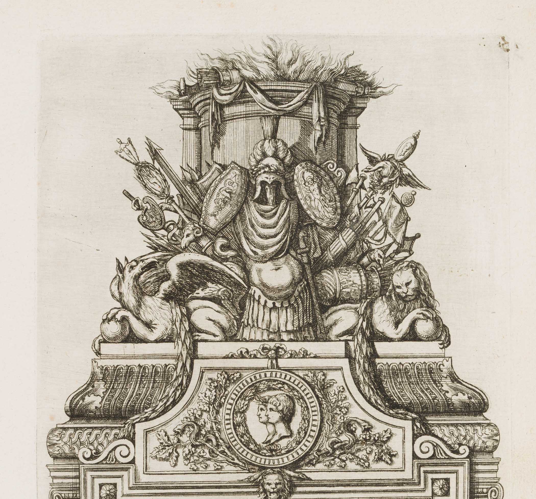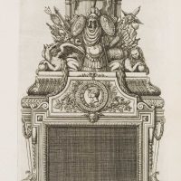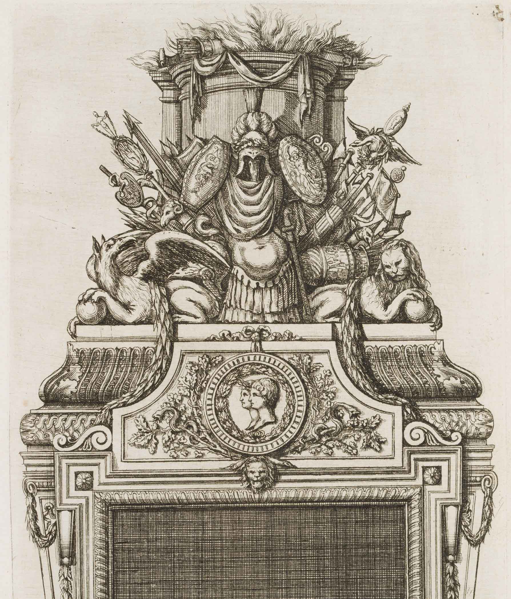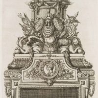 - Schlagworte: Kaminschmuck, Kaminvorlage, Vorlagenblatt, Kamin, mythologischer Figurenschmuck, Waffen, Architektur, Schlacht, Frankreich, Katze, Barock, 1750-1799
