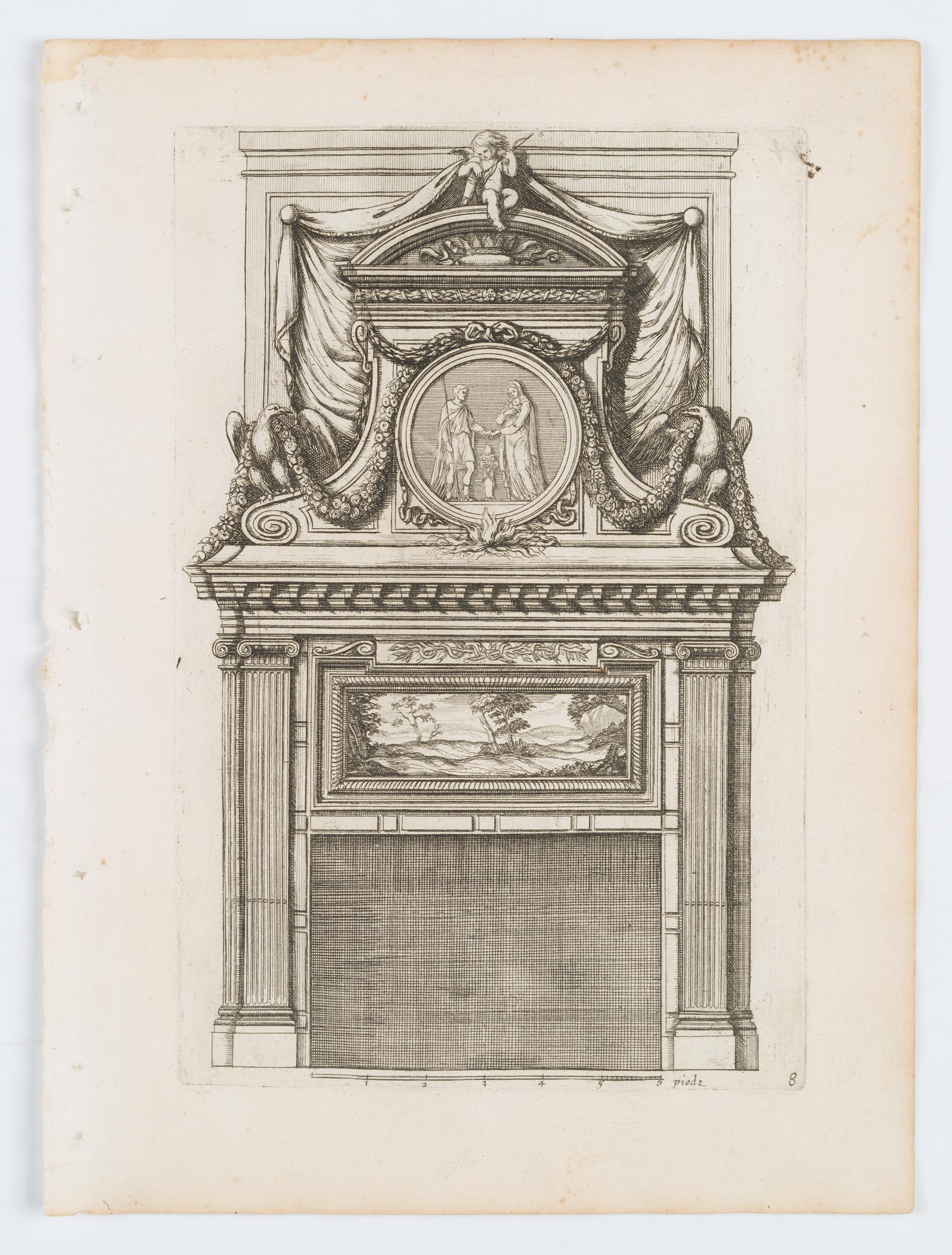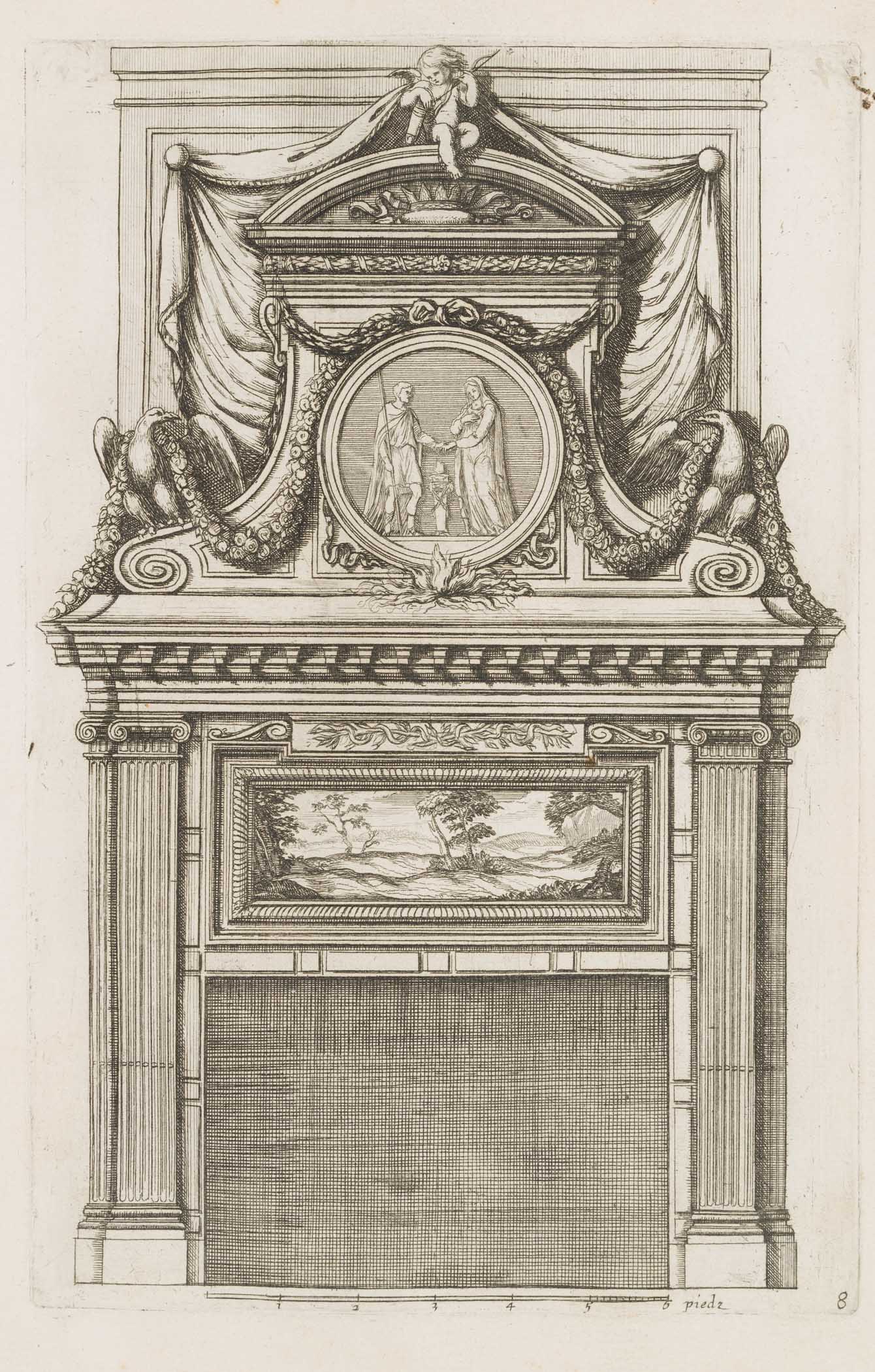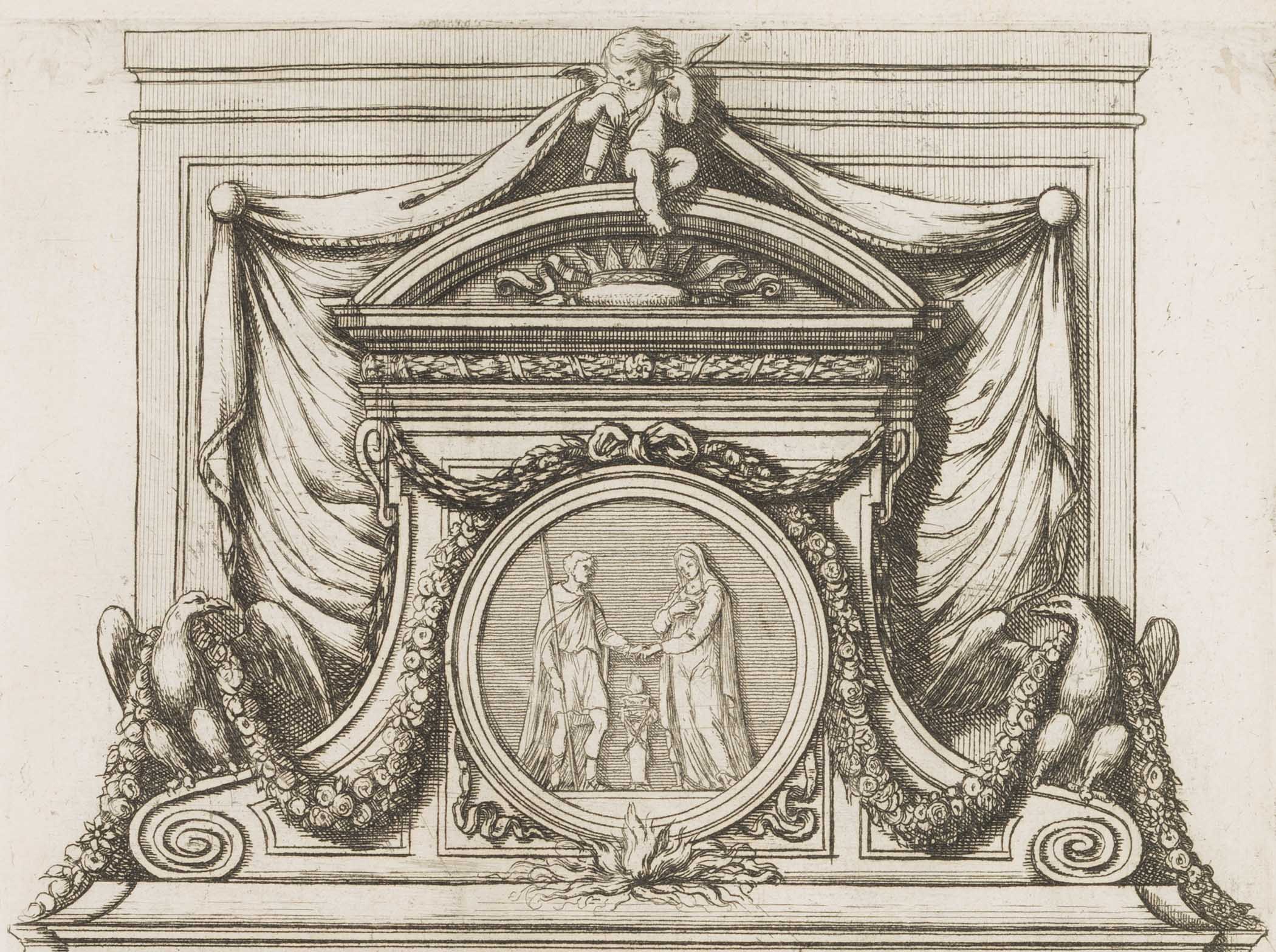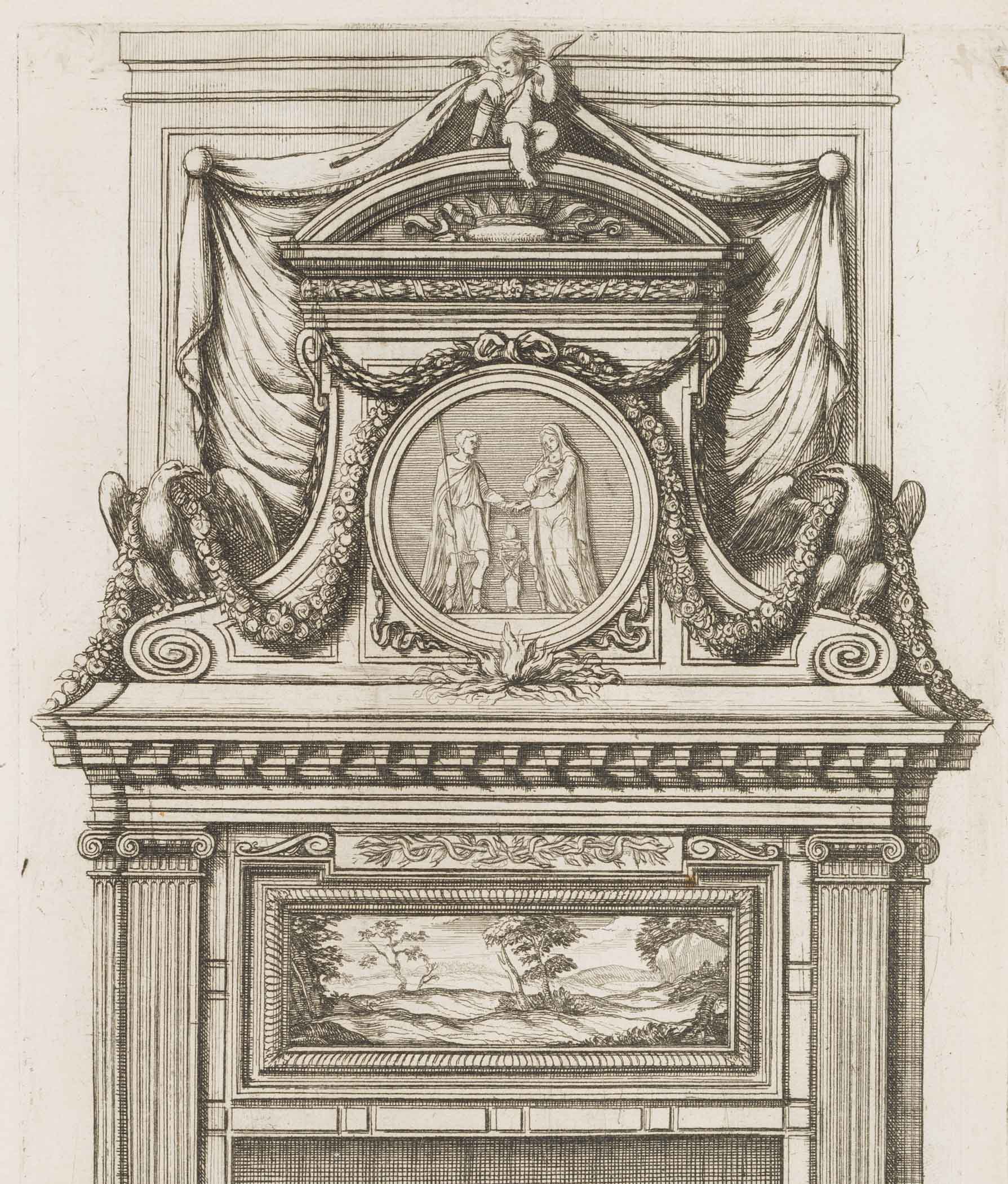 Unbekannt (18. Jahrhundert), Barocker Kaminentwurf mit Landschaftsdarstellung und Vermählungsszene. Vorlage 8 (2), um 1750, Kupferstich