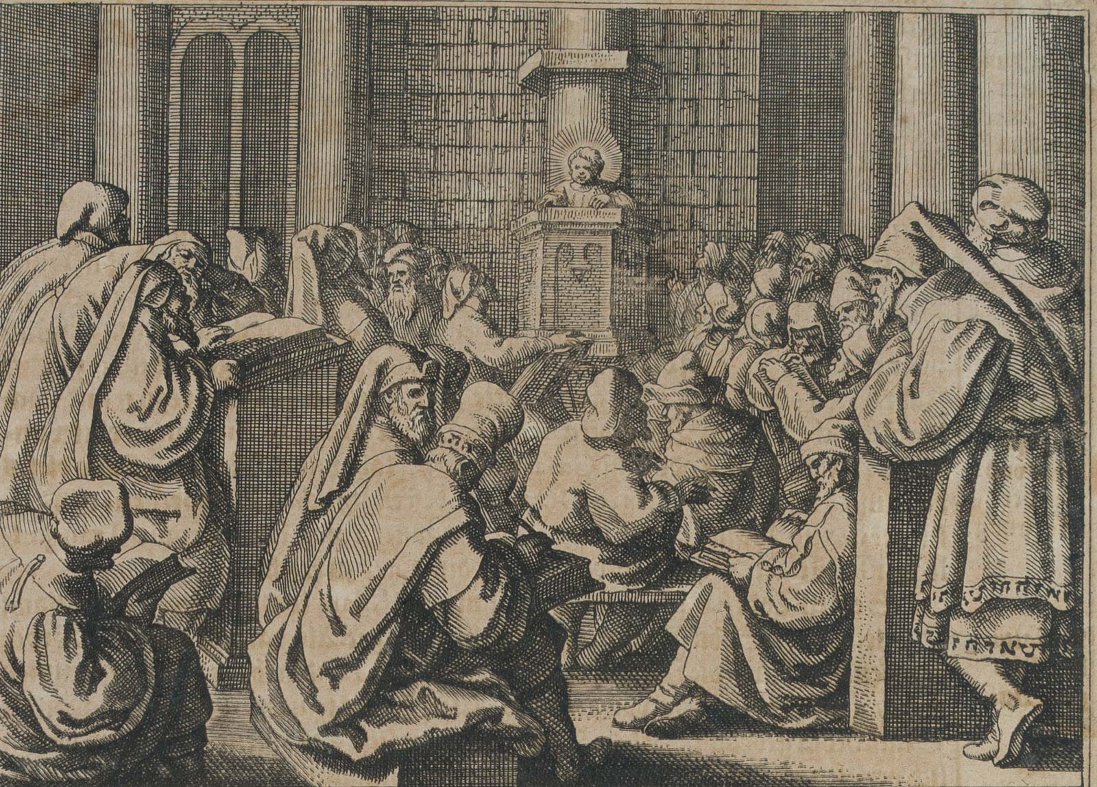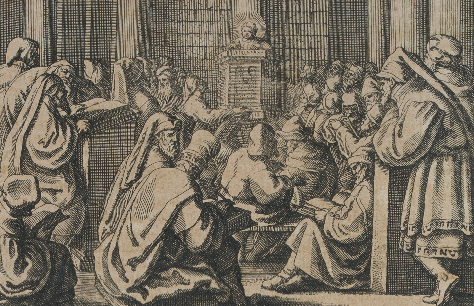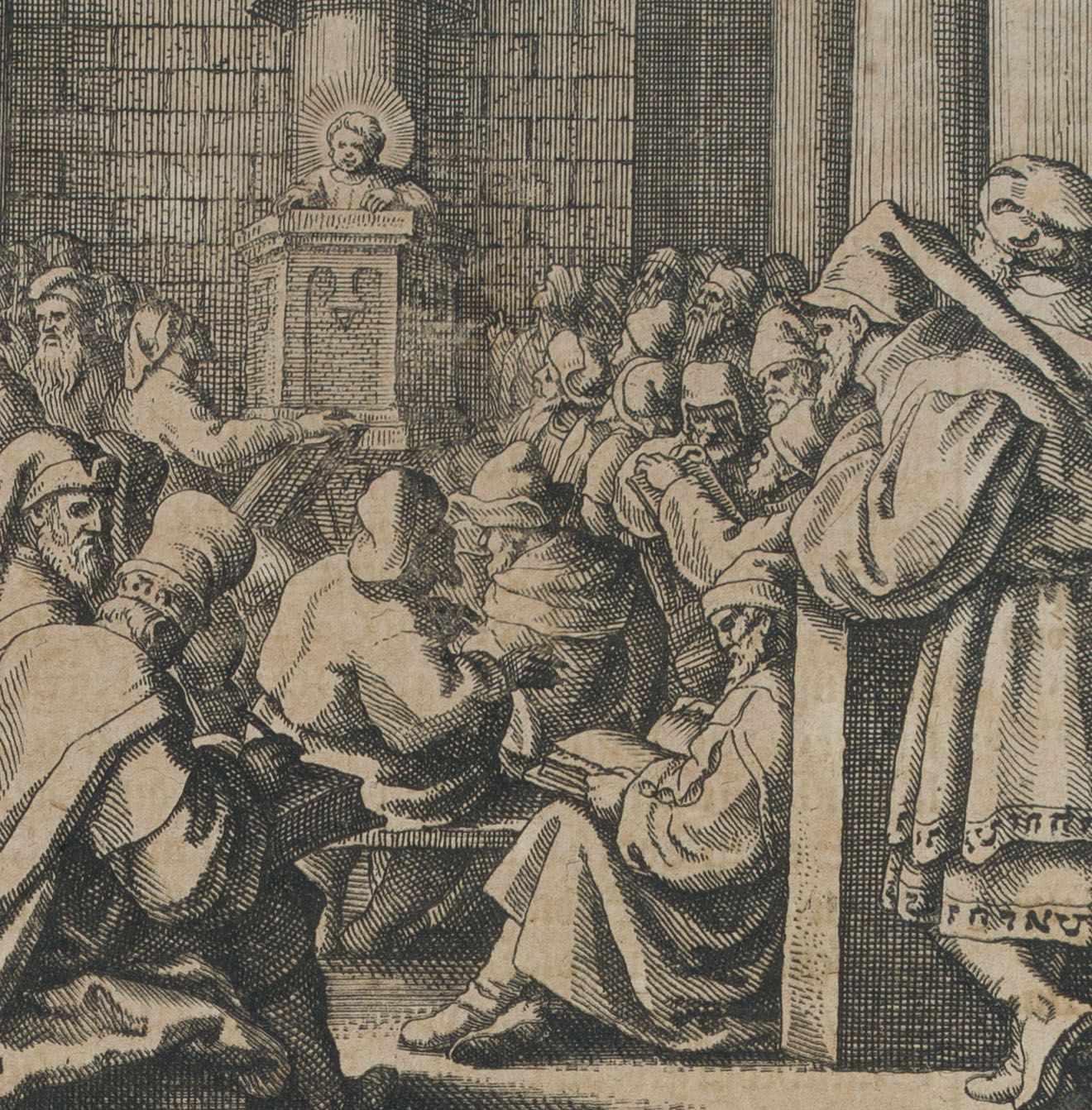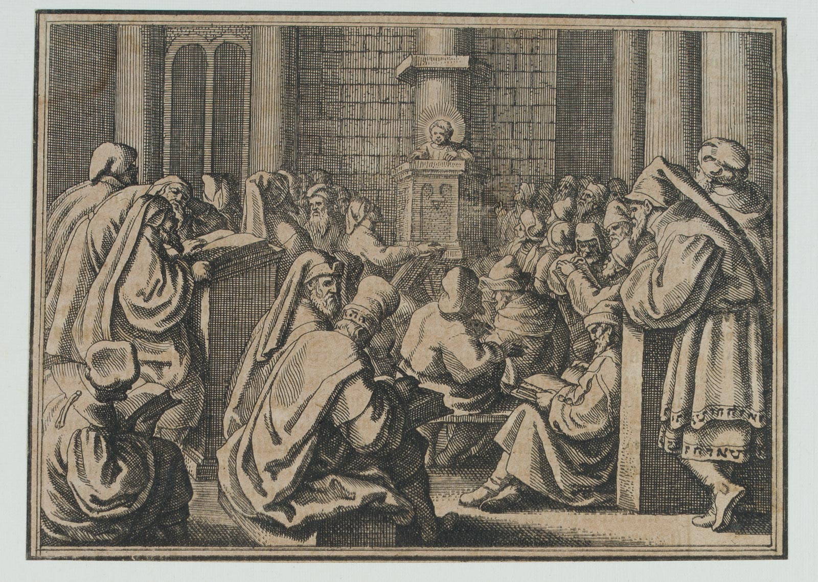 Unbekannt (18. Jahrhundert), Bibelillustration. Der zwölfjährige Jesus im Tempel mit den Schriftgelehrten von einem Strahlenkranz um den Kopf erleuchtet, 18. Jahrhundert, Kupferstich