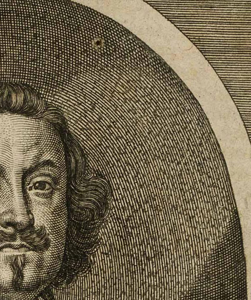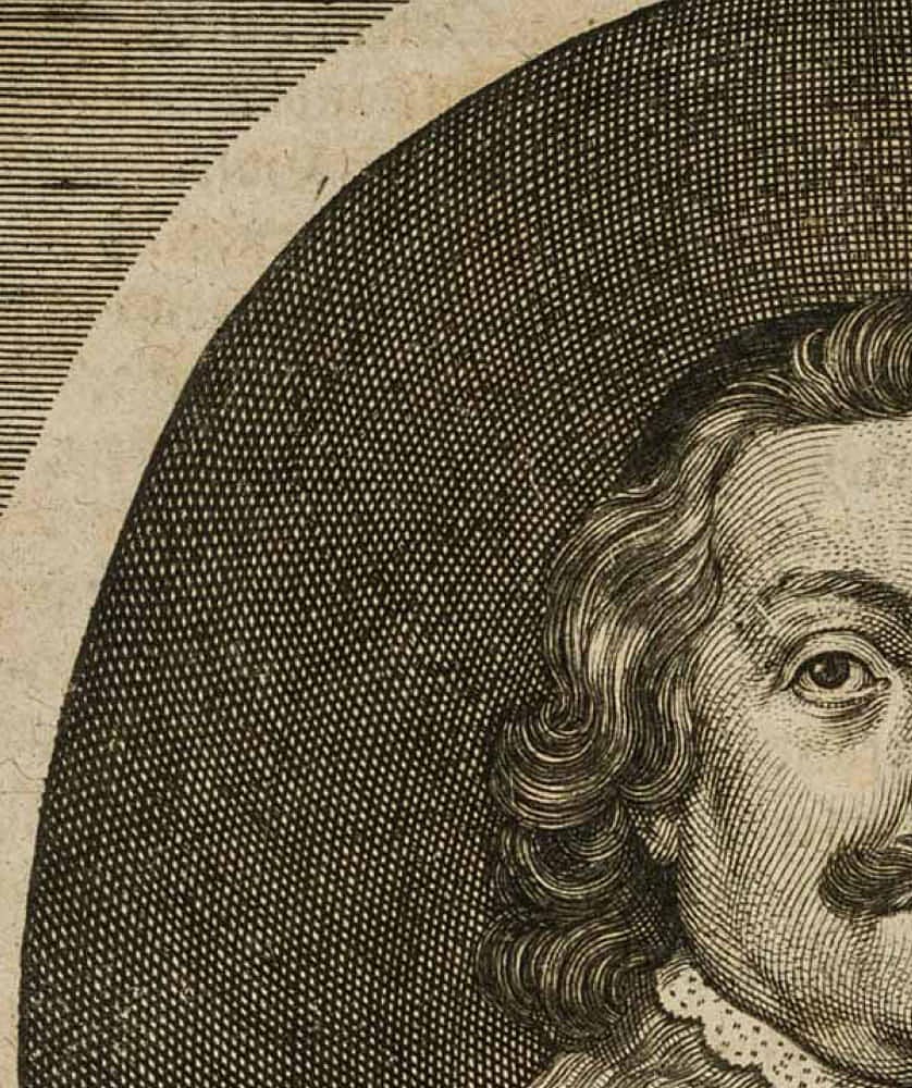 • Beschreibung: Unter dem oval gerahmten Porträt sind auf Lateinisch der Name des Dargestellten und seine Ämter gelistet.