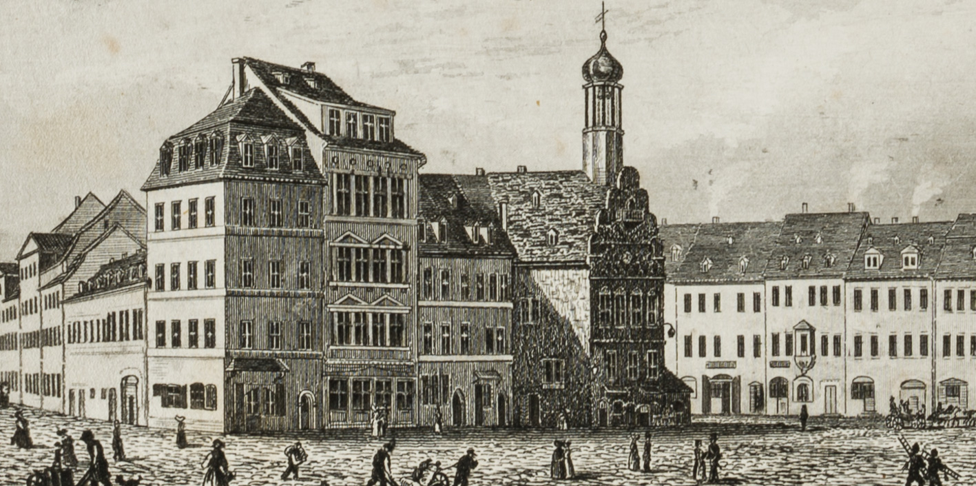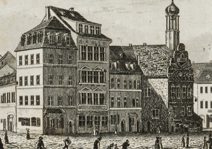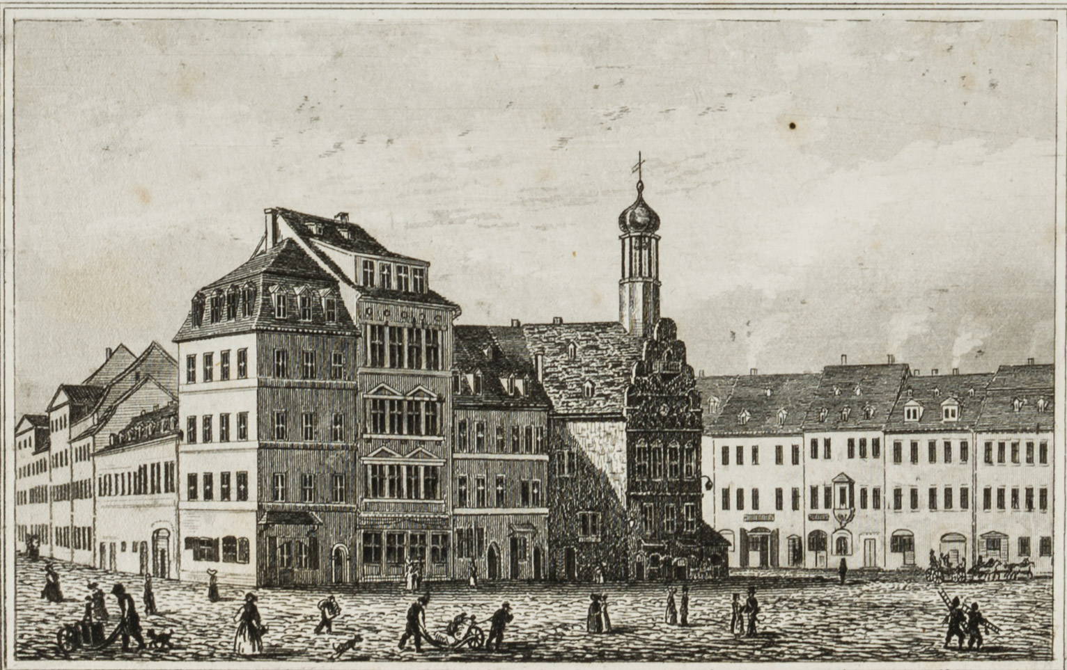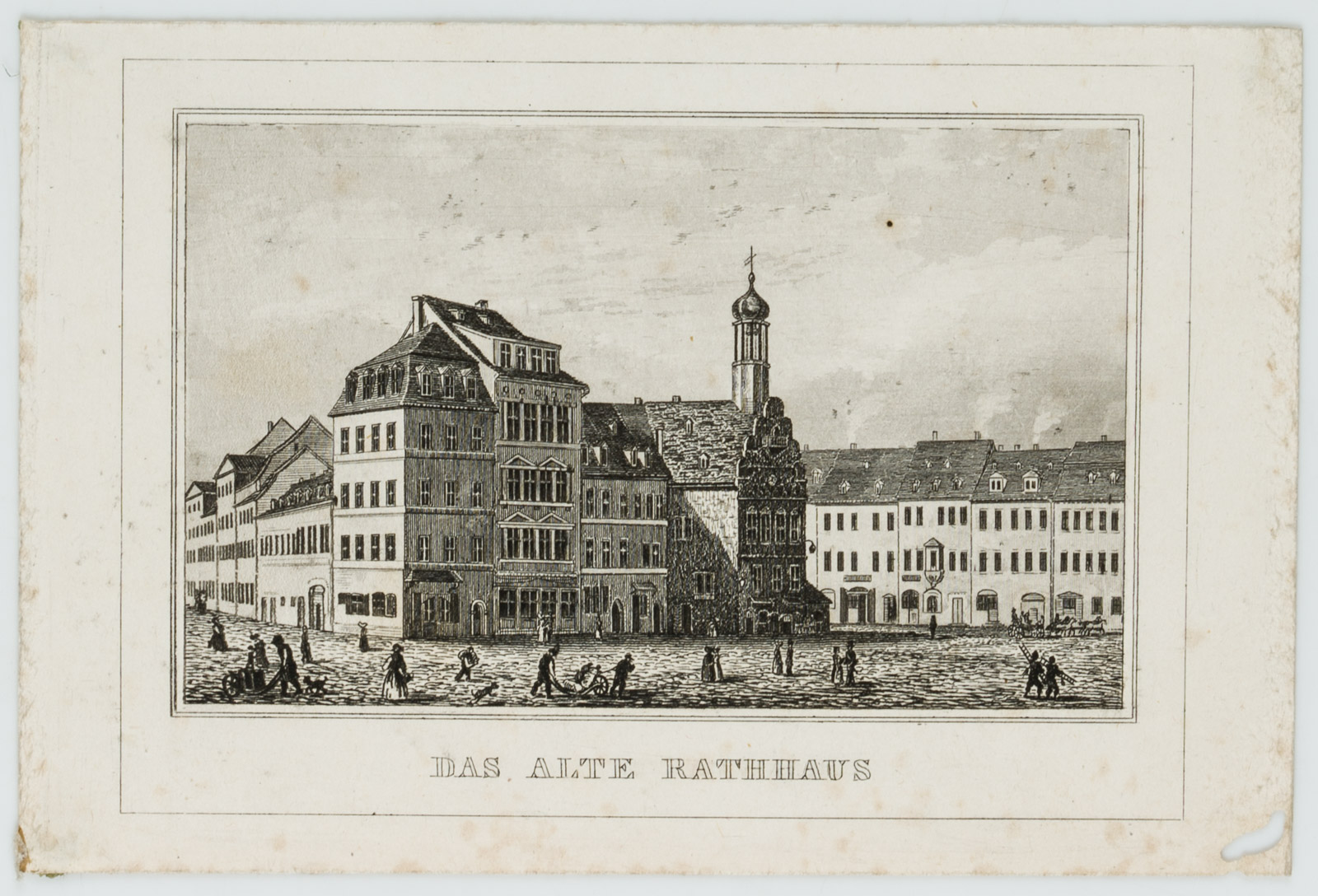 Unbekannt (18. Jahrhundert), Blick auf das alte Rathaus mit Zwiebelturm und einem von Staffagefiguren belebten Vorplatz, Architekturdarstellung, 18. Jahrhundert, Kupferstich