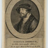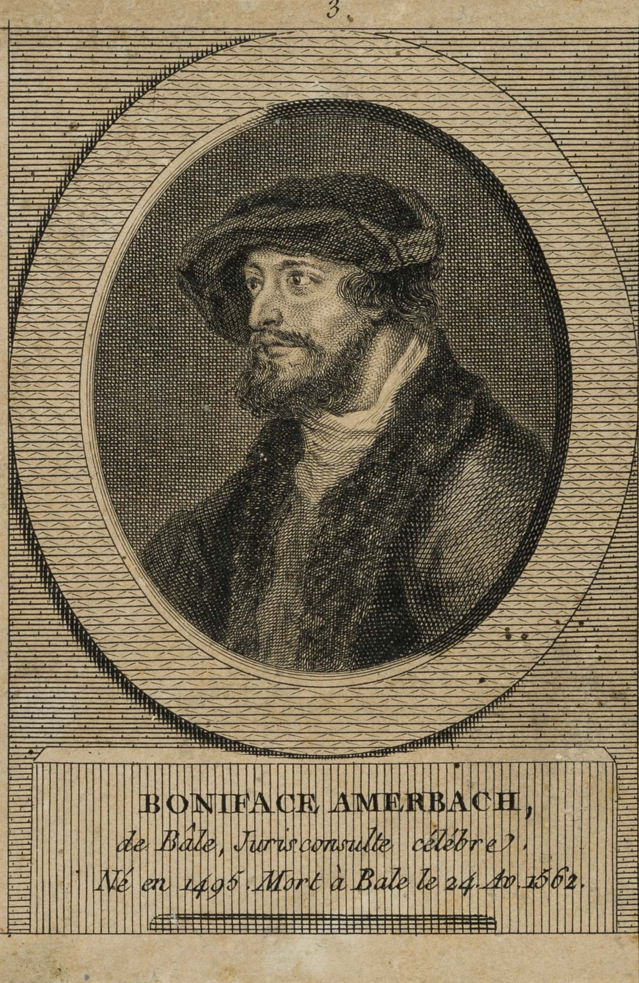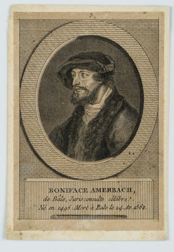 - Inscription: Inscribed below with the sitter’s name and life data: “BONIFACE AMERBACH, de Bâle, Juris consulte célèbre. Né en 1495. Mort à Bale le 24. Av. 1562.”. Numbered “3” above.