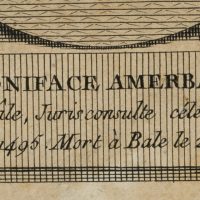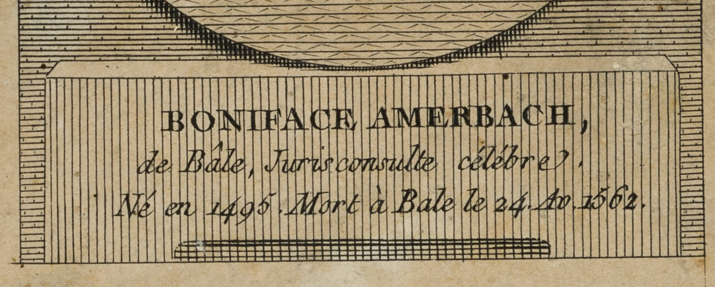 - Bezeichnung: Unterhalb beschriftet mit dem Namen und Lebensdaten des Dargestellten: “BONIFACE AMERBACH, de Bâle, Juris consulte célèbre. Né en 1495. Mort à Bale le 24. Av. 1562.”. Oberhalb nummeriert mit “3”.