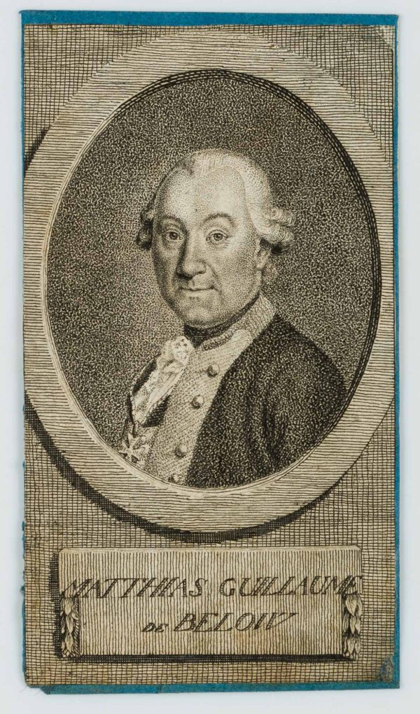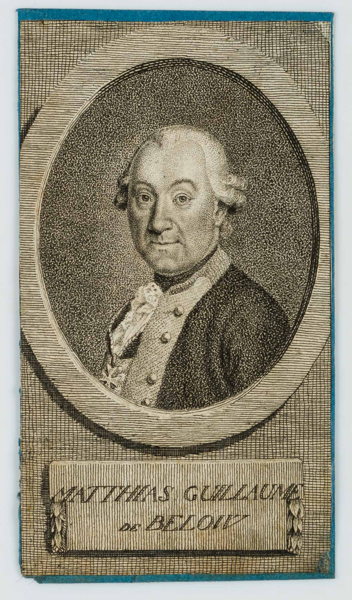 • Bezeichnung: Unterhalb beschriftet mit dem Namen des Dargestellten: “MATTHIAS GUILLAUME DE BELOIV”. Rückseite des Blattträgers mit Rest einer Graphik.