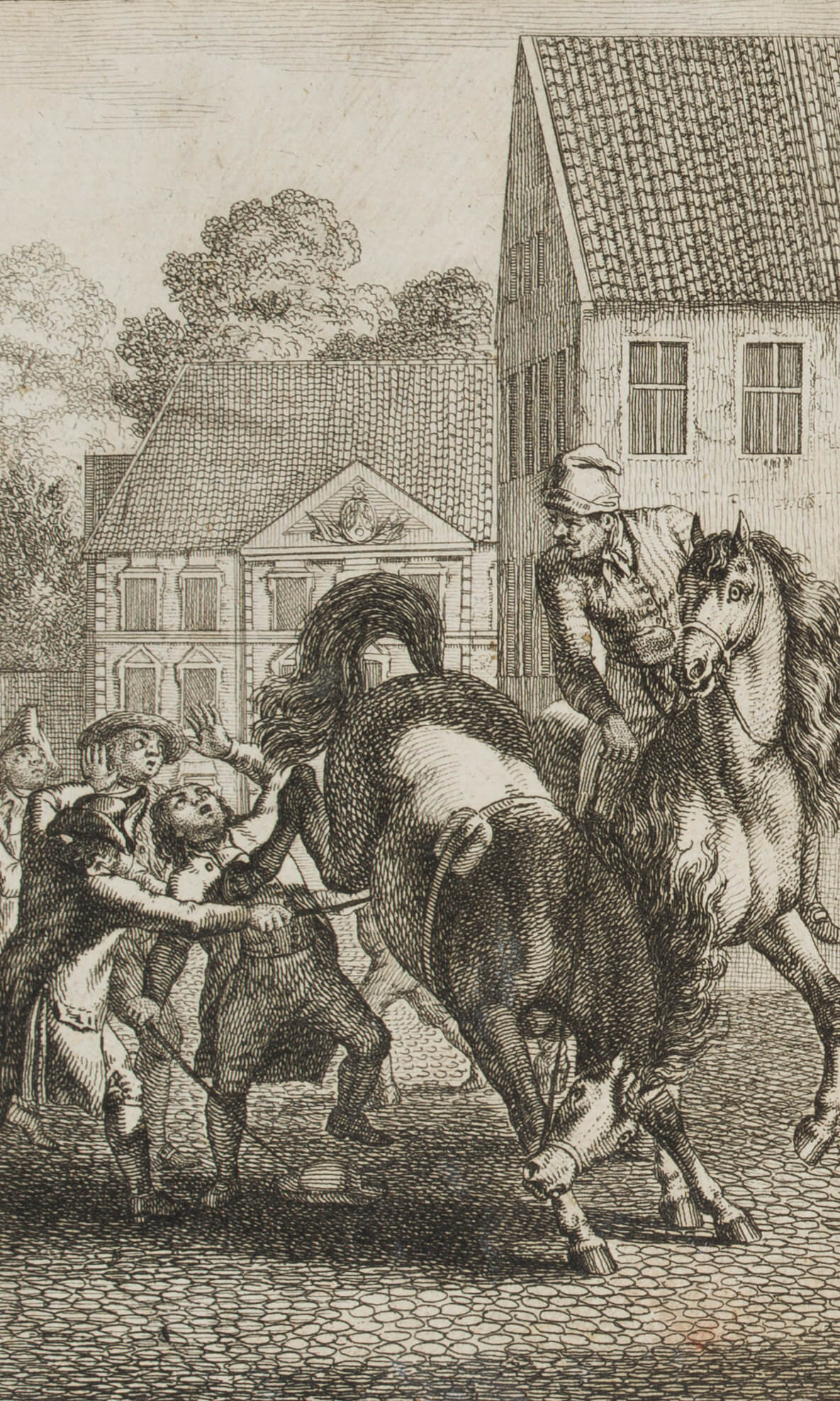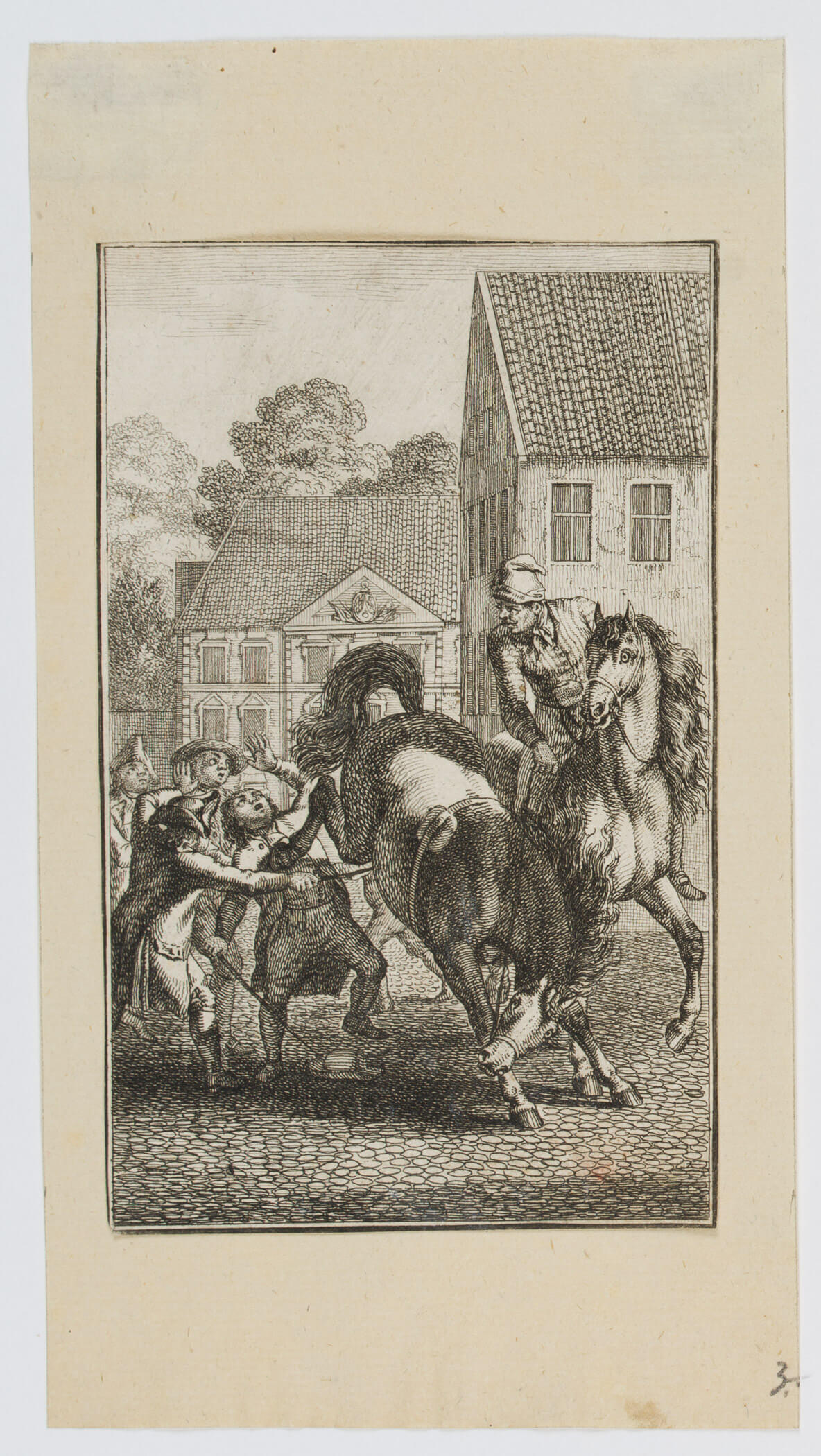 Unknown (18th century), Book illustration with a lunging horse kicking a rear man in the chest, 18th century, Etching