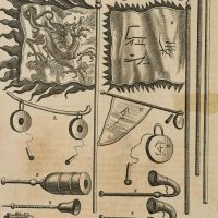 - Beschreibung: Darstellung mit 15 verschiedenen Fahnen, Wimpeln, Symbolen und Instrumenten aus der chinesischen Kultur des 18. Jahrhunderts. Eine Flagge mit einem Drachen fällt besonders in den Blick, daneben Blasinstrumente und Trommeln.