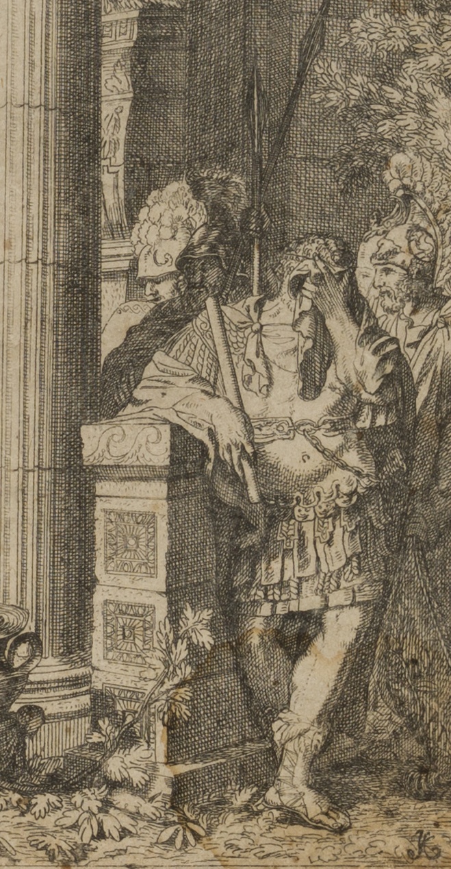 - Beschreibung: Darstellung der biblischen Szene um die Opferung Isaaks. Hier situiert vor einem römischen Tempel.