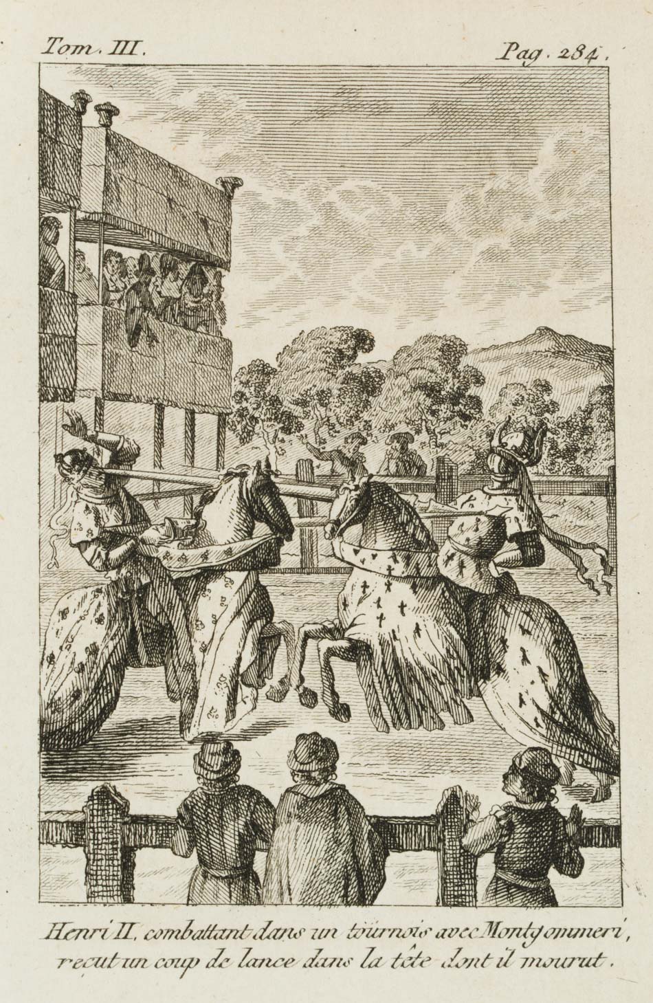 - Description: Scenic depiction of two knights jousting. Illustration of the historical scene of the death of King Henry II of France. His opponent Count Gabriel de Lorges of Montgommery (1526 Ducey – 1574 executed in Paris) hit the king’s head in a tournament match on 30 June 1559 and thrust his lance through his eye. The king died of the consequences of the injury a few weeks later.