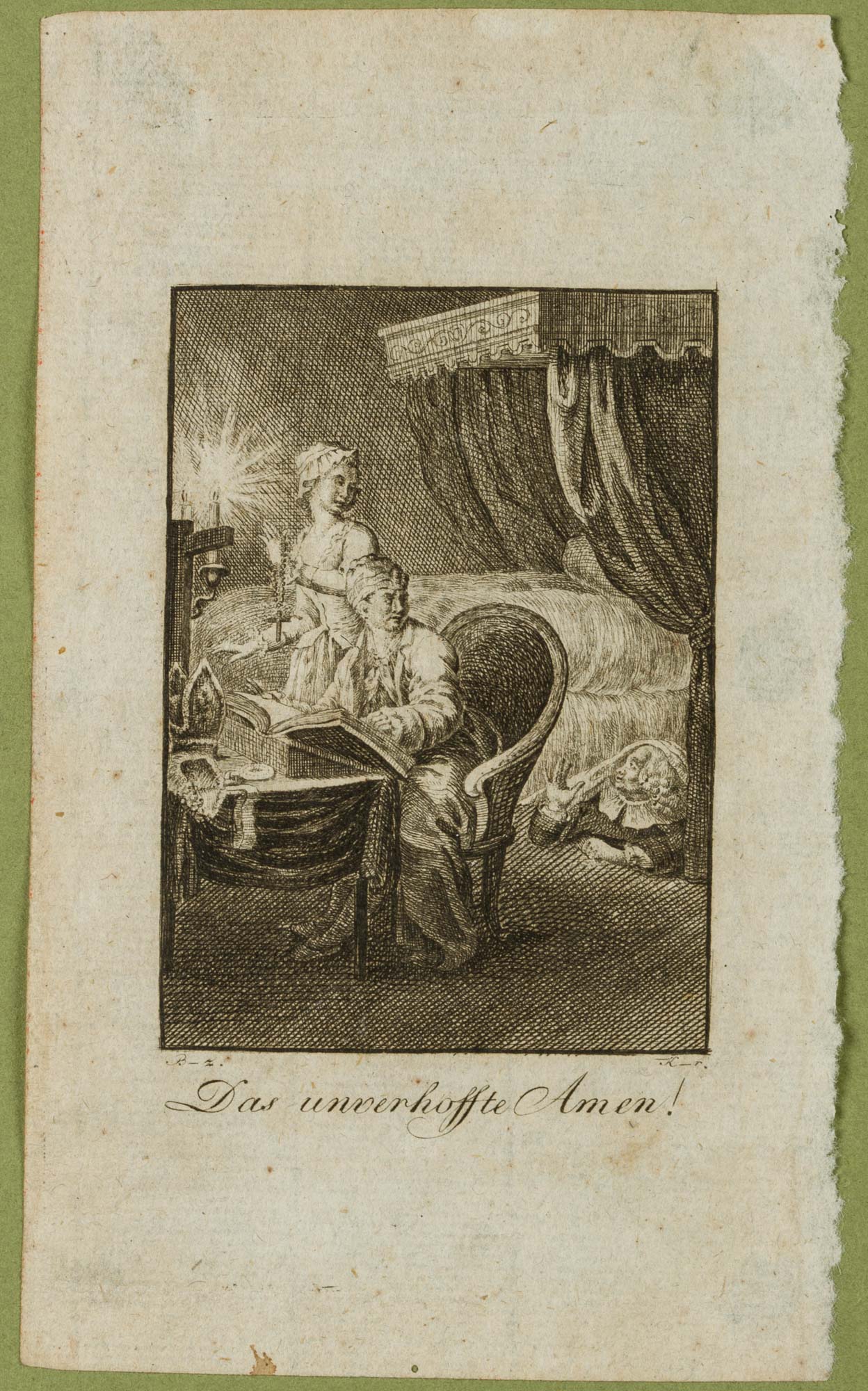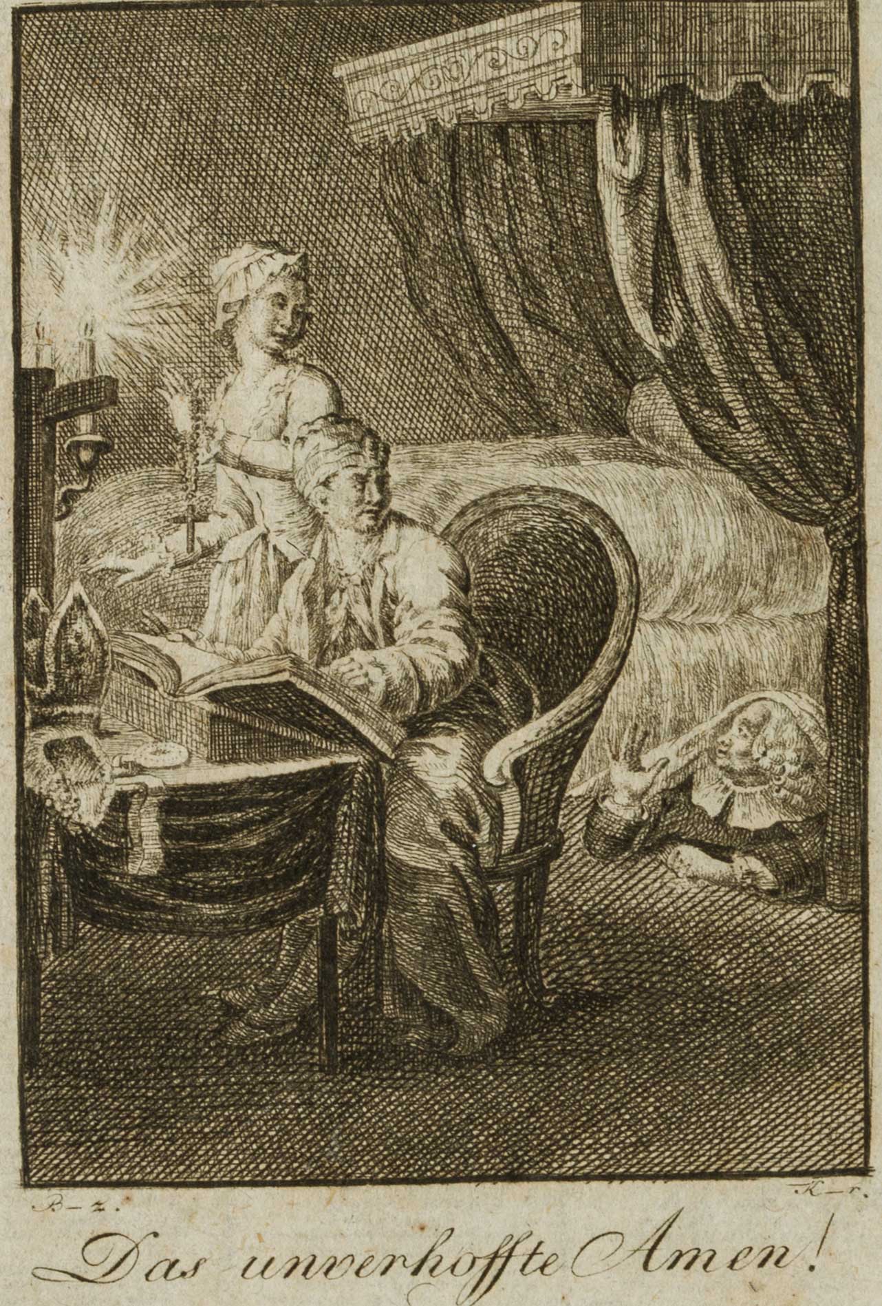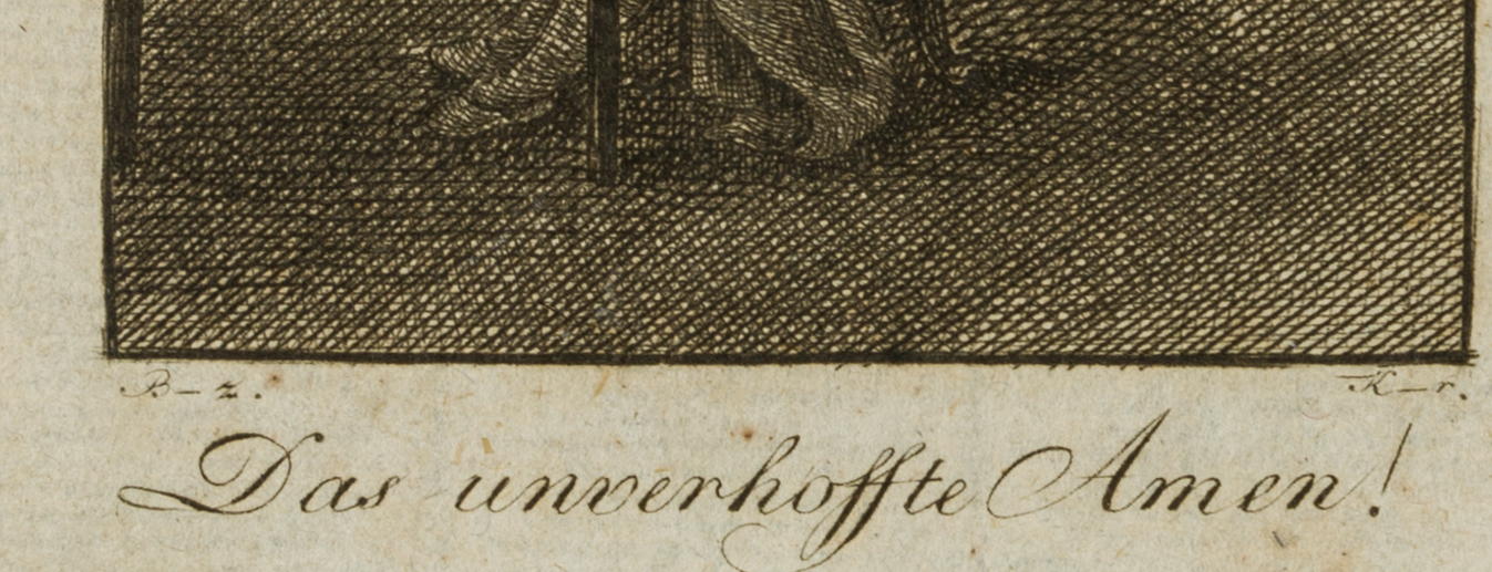 - Inscription: Signed on the left under the print: “B-z.” and on the right “K-r.”. The print bears the caption: “Das unverhoffte Amen”.