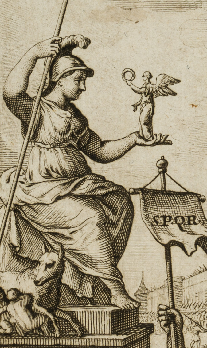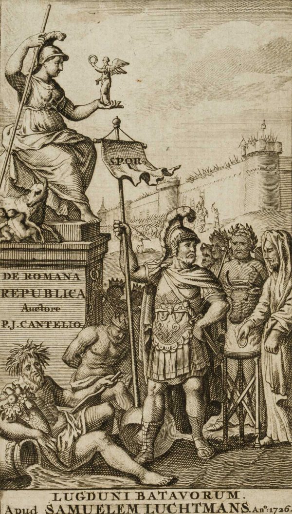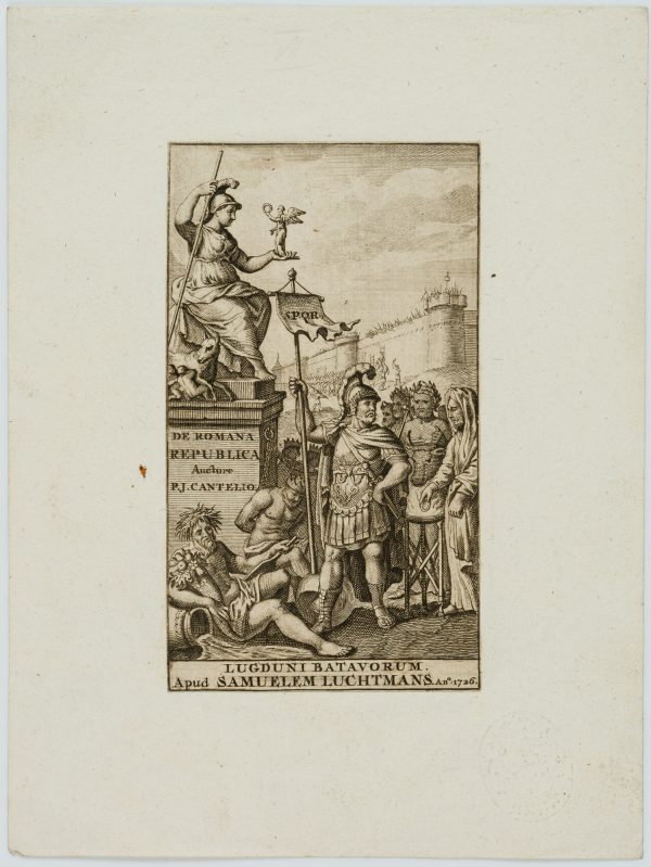 - Description: From: “De Romana Republica, Sive De Re Militari & Civili Romanorum : Ad Explicandos Scriptores Antiquos”, Petro Josepho Cantelio, published by Samuelem Luchtmans, Lugduni Batavorum, 1726. Very beautiful, multi-figured print, with among others Roman soldier, Romulus and Remus as well as Bacchus with cornucopia in the left foreground.