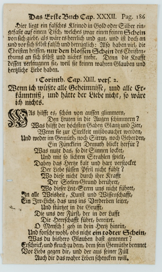 - Beschreibung: Bild ist unterhalb mit dem Titel “Der bloße Schein” bezeichnet. Illustration aus Johann Arndts (1555-1621) Kompilation “Sechs Bücher vom wahren Christentum nebst dessen Paradies-Gärtlein”. Rückseite mit typographischem Druck. Beachten Sie dazu unsere weiteren Angebote zu Johann Arndts Kompilation.